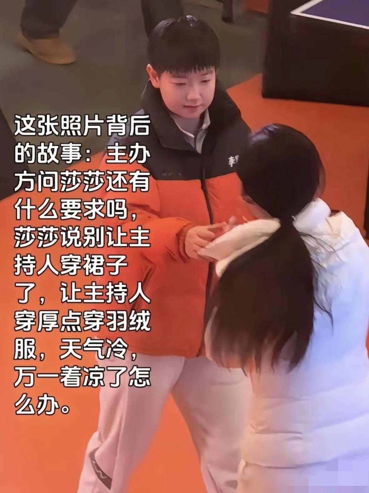 感谢孙颖莎! 和莎莎相处过的人都会被她的细心、贴心感动。莎莎在一次汰渍品牌线下活动中,所主办方问莎莎有什么愿望。 莎莎说:“希望主持人穿羽绒服主持节目。” 那一次,同位女性的主持人,感动的在社交平台分享她眼中有爱的莎莎。 这一次,运动赛事主持人王小青, 他说:“主办方知道他和莎莎一起合作过,本来应该单外套主持节目的,给贴心的准备了外套和暖宝宝。零下十几度的冬天,也变得格外温暖。” 没想到2025年的一件温暖的事在2026年的第一天,就变成了一场变革,真好!