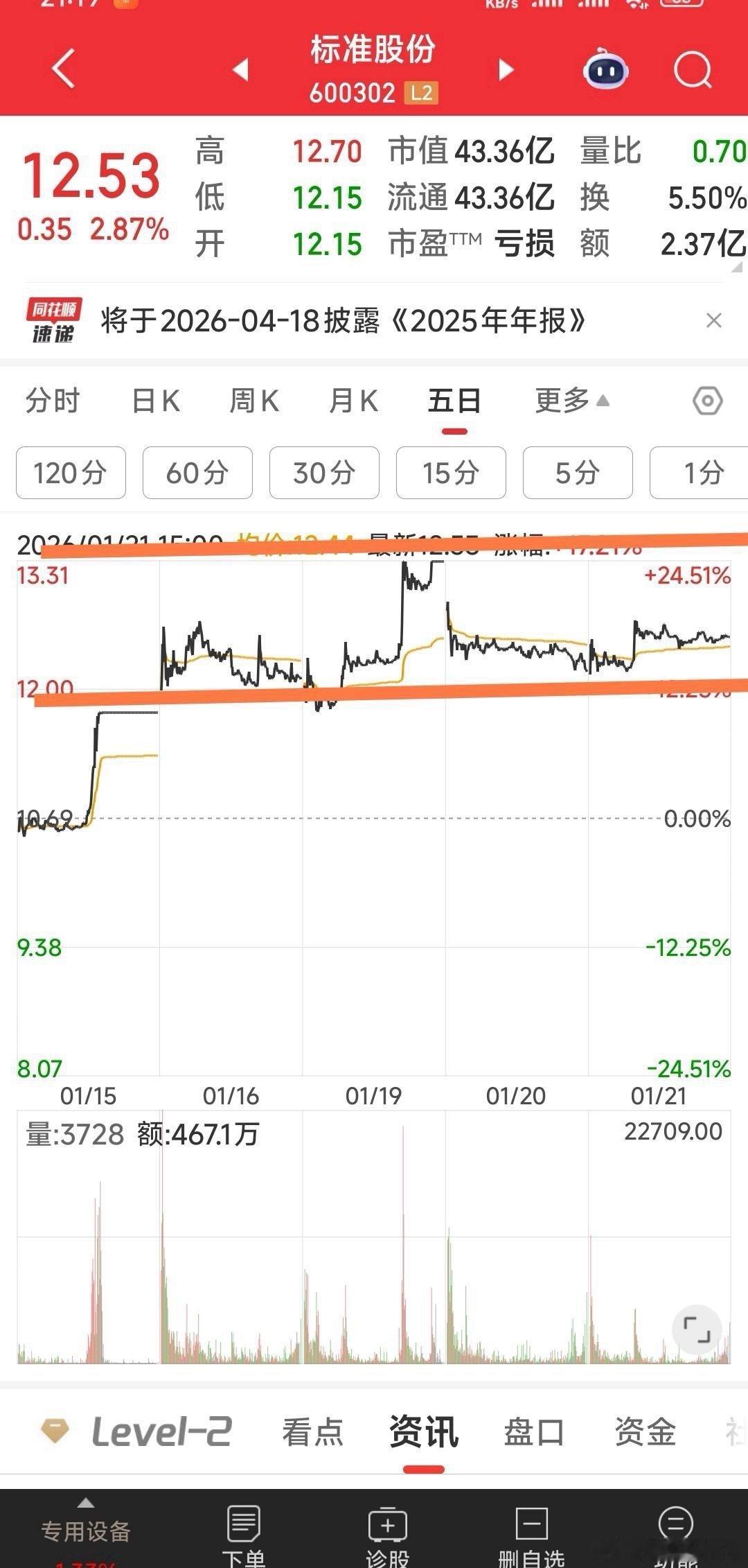 【回复】很多人问标准股份怎样,从技术上来说明天应会向上,别听一些人说这说那,我们看二图。①5天分时图明显在12至13.31元箱体中,面临方向选择。②方向上从60分钟K线看,明显60分钟M4均线V型待向上运行,一但站上12.7元就向上确立,并有向新高13.31冲击的可能。有人说没见股权转让公告,怕这怕那,实话实说,一但公告有利好还有你上车的机会吗?标准不管最终股权能否转让我们不说,至少等个招募新大股东接27%股权的要求公告是100%会出的!时间我预估还有6个工作日之内。若出公告了有一波上涨,再等10天也值。哈,苦口婆心说这多,只给有缘人语。所有一切有异议的朋友,请千万管住自己的手,不要听信于我与我同车而行,我并不太喜欢与不投缘的人一起玩。与有肝胆人共事,从无字句处读书。