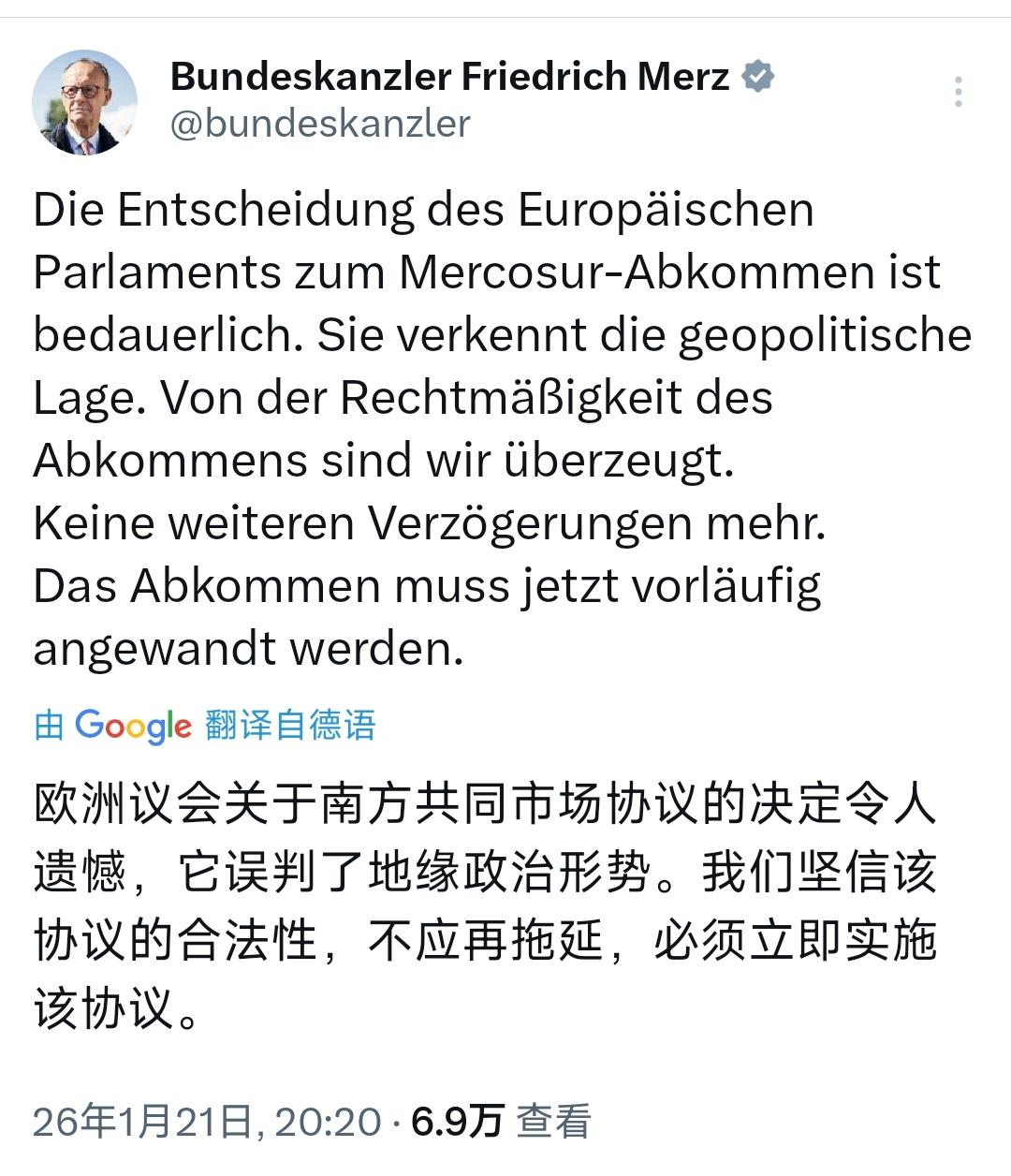 德国总理默茨今晚(北京时间1月21日晚)写道:“欧洲议会关于南方共同市场协议的决定令人遗憾,它误判了地缘政治形势。我们坚信该协议的合法性,不应再拖延,必须立即实施该协议。” [机智]评几句:欧洲议会将欧南自贸协议提交司法审查,可能导致协议落地推迟两年,这一幕赤裸裸暴露了欧盟的内部分裂痼疾。工业派如德国急于推进协议抢占南美市场,农业国则担忧本土产业受冲击,欧洲议会与成员国的立场撕裂、利益博弈,让欧盟在关键经贸布局上步履维艰。默茨的怒斥道破核心:欧盟连一份自贸协议都无法高效推进,其所谓的战略自主不过是泡影,内部分歧的掣肘,终将让欧洲在全球地缘格局中错失机遇、步步被动。
