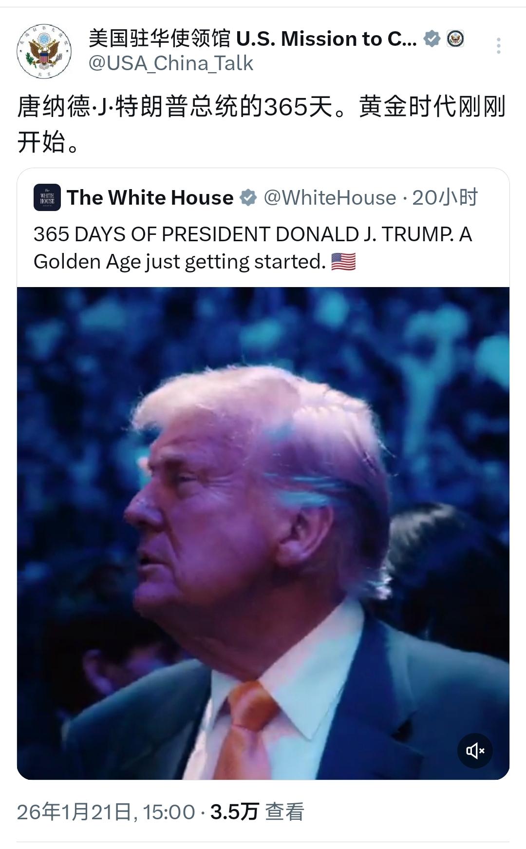 美国驻华使领馆今天(1月21日)写道:“唐纳德·J·特朗普总统的365天。黄金时代刚刚开始。” [机智]评几句:在这365天中,美国驻华使领馆的风格也变成了马屁精风格。大体上表达的都是:川赢,川又赢,川还赢,川总赢……但是实际上,特朗普第二任期给全世界带来的是危险、混乱和不确定。