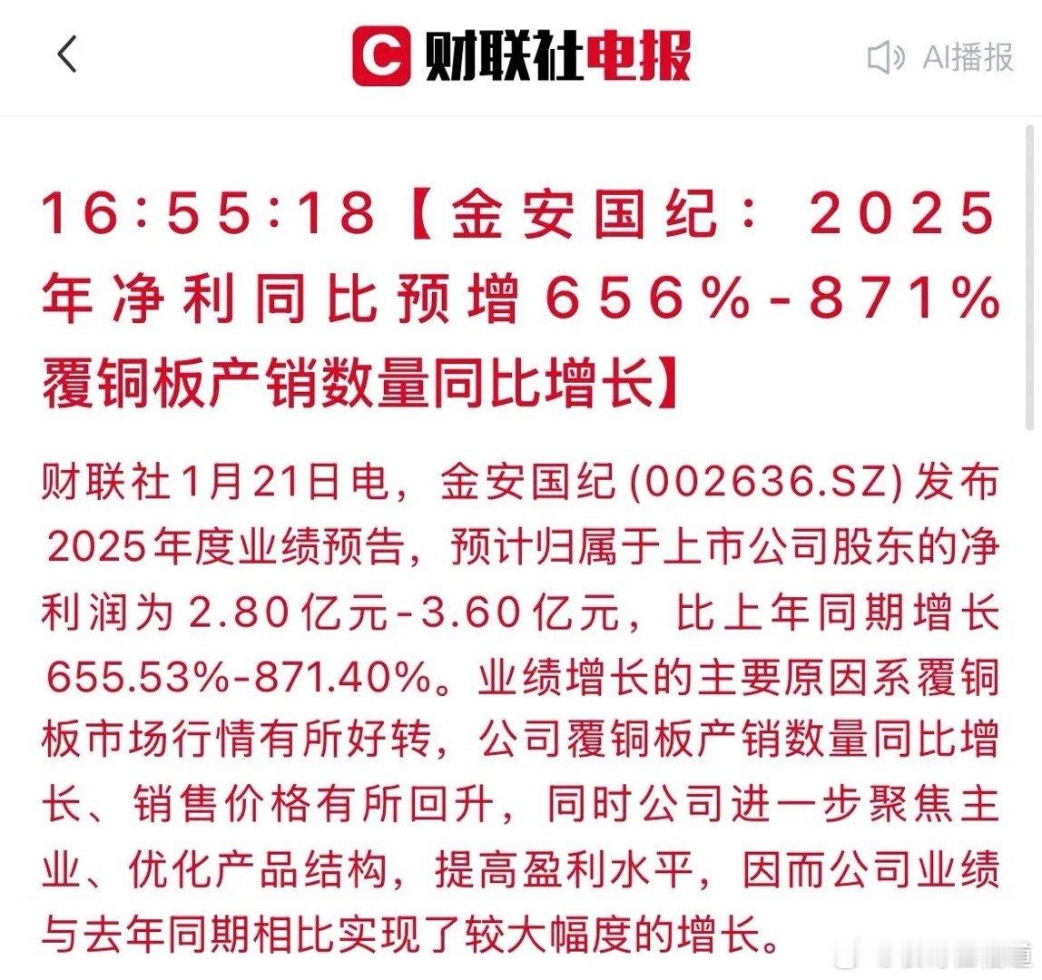 爆了!“金安国纪”业绩预告出炉,最高暴涨871%!刚刚,金安国纪发布业绩预告,好家伙,净利润预计2.8亿到3.6亿,同比暴涨656%到871%!去年这时候,覆铜板行情还冷冰冰的,股价也磨人。没想到今年直接大翻身,公告里说市场好转,产品不仅卖得多了,价格也上来了。公司还优化了产品结构,盈利水平显著提升,业绩实现跨越式增长。明天大概率要抢跑高开了,手里有筹码的股东们,恭喜了!市场情绪必将热烈反应,但行情能否持续,仍需观察后续量价配合!