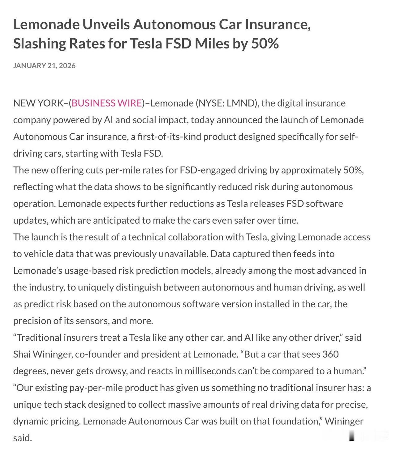 特斯拉新闻:2026年1月21日,Lemonade宣布推出业内首个专门针对自动