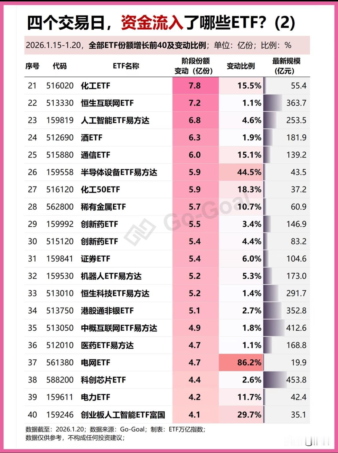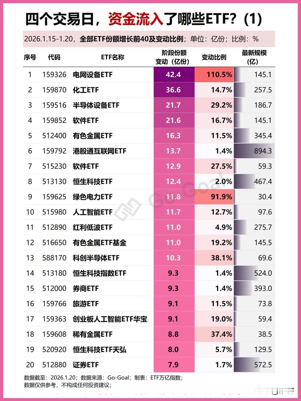 宽基ETF份额减少、资金净流出都去了哪里? 根据显示科创50、沪深300、上证50等相关ETF份额减少的最多,也就是咱们的“准平准基金”用于稳定股市的工具持续几天资金净流出,每天都以创纪录的交易量发生着,上证50ETF昨日更是创出了10年交易量的新高。 有出就必有进,这些资金都流去哪里了呢? 或许最近大热的几个板块是主要方向。首先是电力板块和芯片半导体板块,AI的竞争最终都要落地到算力和能源方面,目前芯片半导体行情尚未结束,部分资金就去炒作AI应用,这也是该板块受到打压的一大原因。 其次,恒生科技已经在低位很长一段时间,市场都看好恒生科技在2026年会有十分不错的表现。