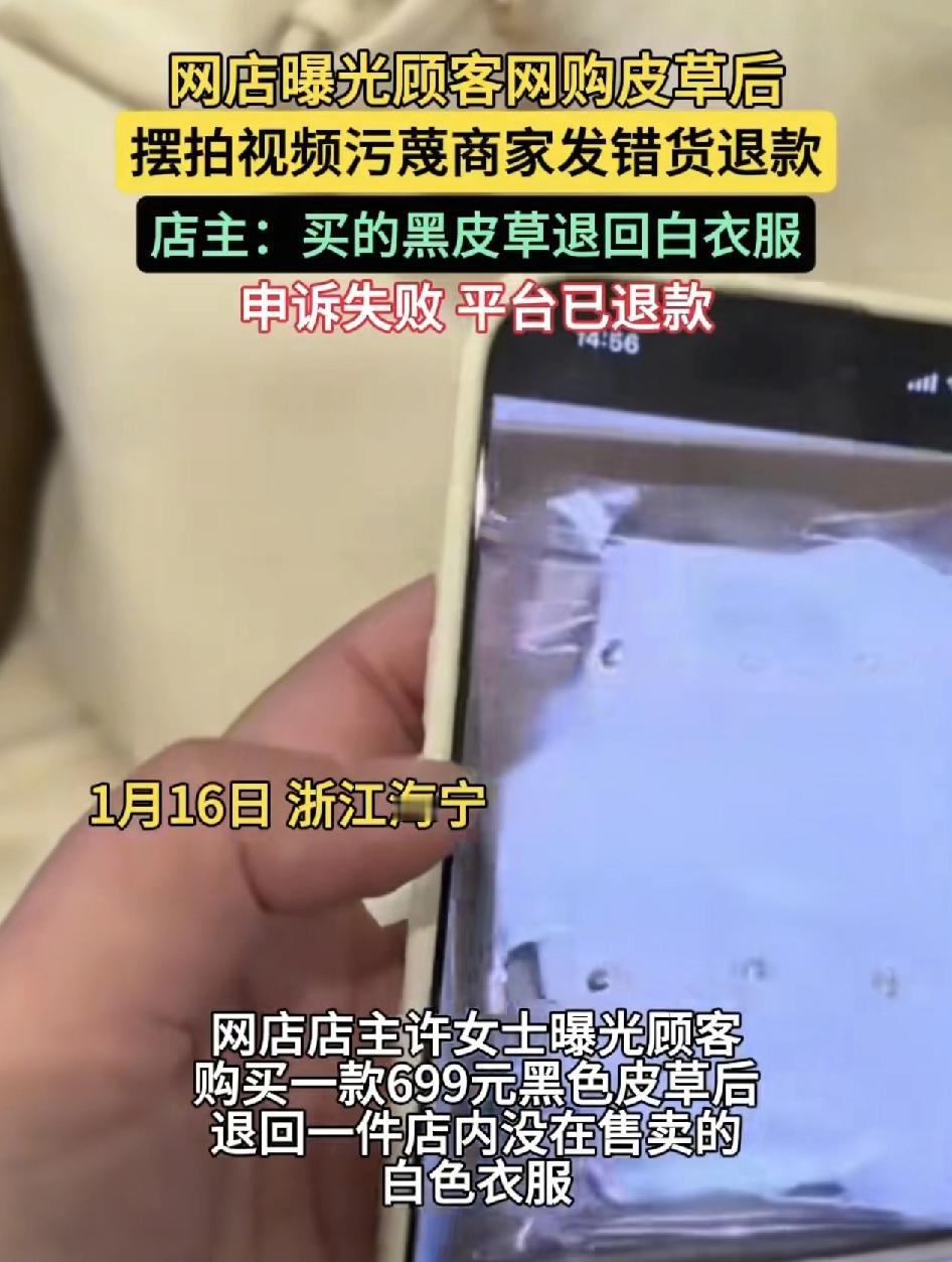 浙江海宁一位电商商家发视频称有顾客购买了一件699元的皮草大衣,没想到退回来一件店内没在售卖的衣服,于是以商家发错货为理由申请退货退款。还附加拍开箱视频,但是商家收到的包裹比发出去的包裹都轻了八两,现在也联系不上顾客,申诉也失败了,可是平台已经给顾客退款了,商家提醒大家发货的时候最好是有打包的视频。