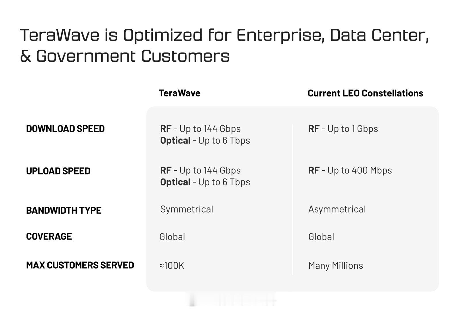 贝索斯旗下的航天公司**蓝色起源(Blue Origin)**刚刚宣布了 TeraWave 计划。这是一个由 5,408 颗卫星组成的通信网络,旨在“在地球任何角落提供高达 6 Tbps 的对称数据传输速度”。蓝色起源官方表示: “该网络将服务于数万名企业、数据中心及政府用户。这些用户在执行关键任务时,需要极其可靠的连接能力。”TeraWave 卫星星座的部署将于 2027 年第四季度正式启动。技术架构与优势 * 多轨道设计: TeraWave 的架构包括 5,408 颗位于**低地球轨道(LEO)和中地球轨道(MEO)**的光学互联卫星。 * 高吞吐量连接: 这种多轨道设计能在全球枢纽与分布式用户之间建立超高吞吐量的链路,实现多吉比特(multigigabit)级别的连接。 * 弥补地面基础设施不足: 该服务特别针对偏远、农村及郊区地区。在这些地方,铺设多样化的光纤路径往往成本高昂、技术上不可行,或部署速度过于缓慢。 * 快速部署与韧性: TeraWave 的企业级用户终端和网关终端可在全球范围内快速部署,并与现有的高容量基础设施对接,从而提供额外的路由多样性,增强整个网络的韧性。