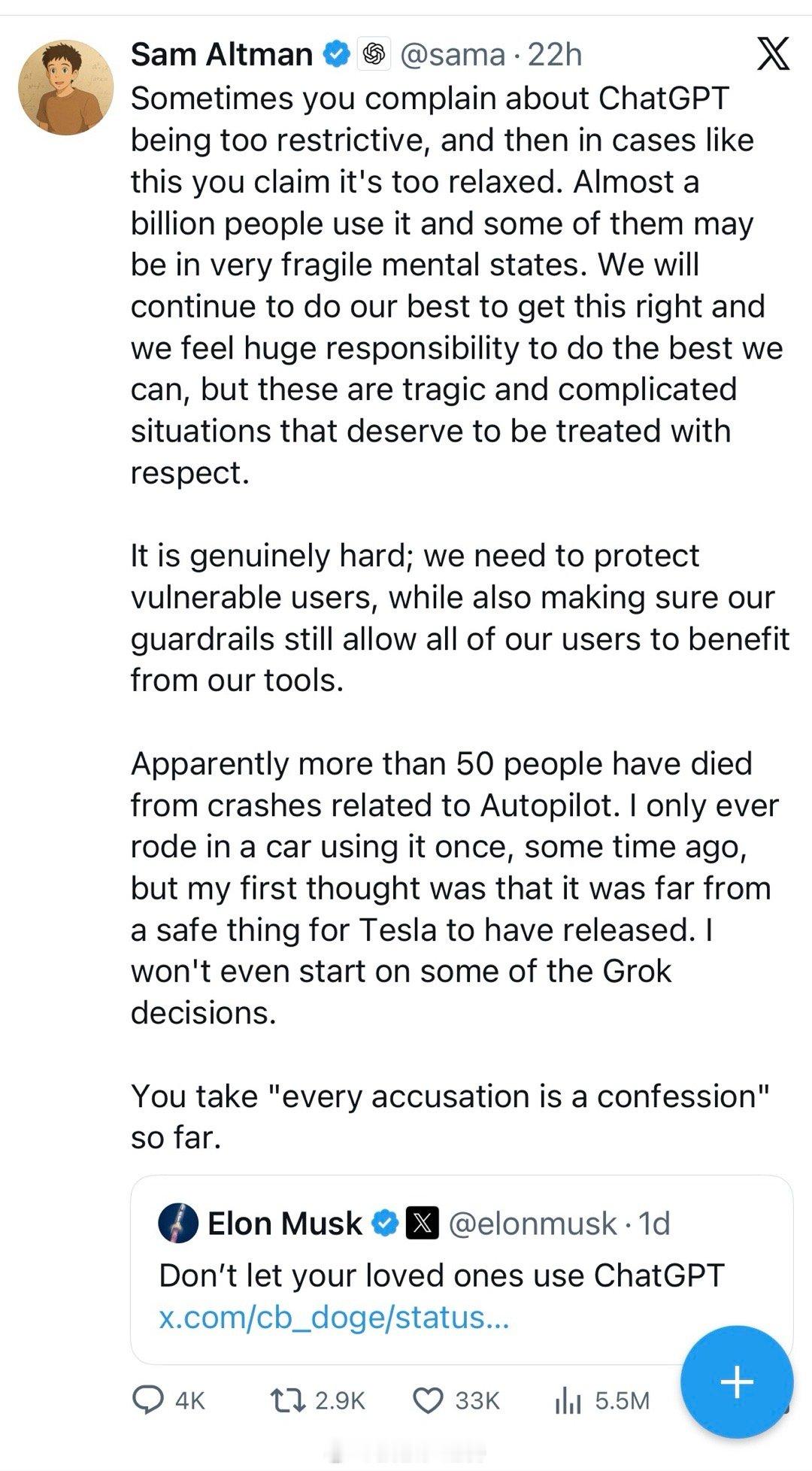 马斯克转发ChatGPT诱导人自杀的帖子:千万别用ChatGPT!奥特曼回怼:有时候你抱怨 ChatGPT 限制太多,而遇到这类情况时,你又声称它太宽松了。全球有近 10 亿人在使用它,其中一些人可能正处于非常脆弱的精神状态。我们会继续尽最大努力把这件事做好,我们也深感责任重大,必须做到最好,但这些都是悲剧且复杂的情况,理应受到尊重。这确实很难;我们需要保护弱势用户,同时还要确保我们的安全护栏依然能让所有用户从我们的工具中获益。据报道,已有超过 50 人死于与特斯拉Autopilot相关的事故。我很久以前只坐过一次开启该功能的车,我当时的第一反应就是:特斯拉发布这个东西远算不上安全。我甚至都不想开始评价 Grok一些决定。到目前为止,你完美诠释了“每一个指责都是一种自黑”。ChatGPT马斯克人工智能