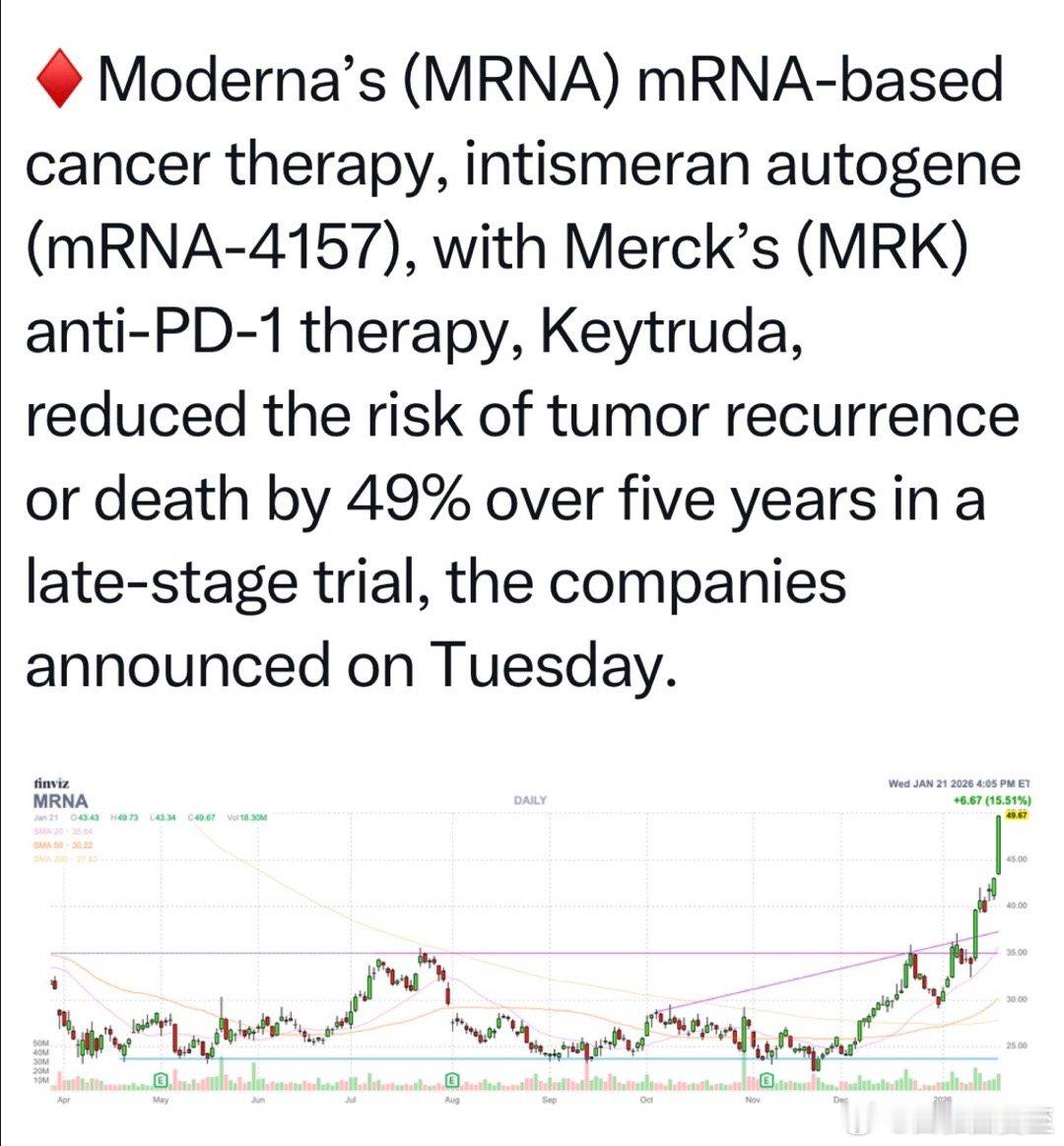 Moderna 的mRNA技术,目前正应用于十多种疫苗的研发其中皮肤癌的疫苗,配合Merck的药物,在完全切除黑色素瘤五年后,复发或死亡率,比单纯用药,降低了49%基于mRNA技术的癌症治疗,前景广阔