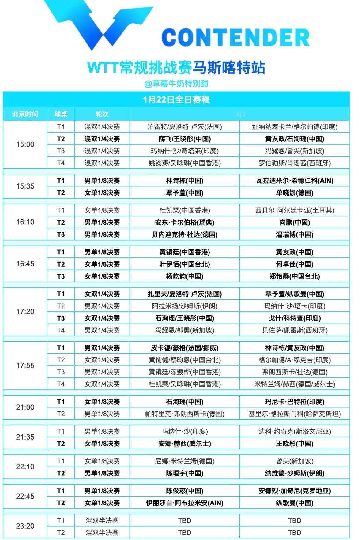 WTT马斯喀特常规挑战赛1月21日赛果及22日赛程 1月21日,梁靖崑的男双和 单打都止步首轮,太遗憾😞! 黄友政3小时三赛,真牛马啊! 20岁正是兼三的年龄, 能有能力兼三,说明上奥运会的机会越来越大! 想到主力或者绝对主力, 都必须走兼三项这一步, 身兼多项才能走得更远, 就是这赛程, 只打一项的放在晚上, 身兼三项的集中在上半场! 梁靖崑脚部有伤,才被黄友政零封, 30岁老将还兼两项, 弄巧成拙, 三站比赛, 梁靖崑都没有挣到积分……