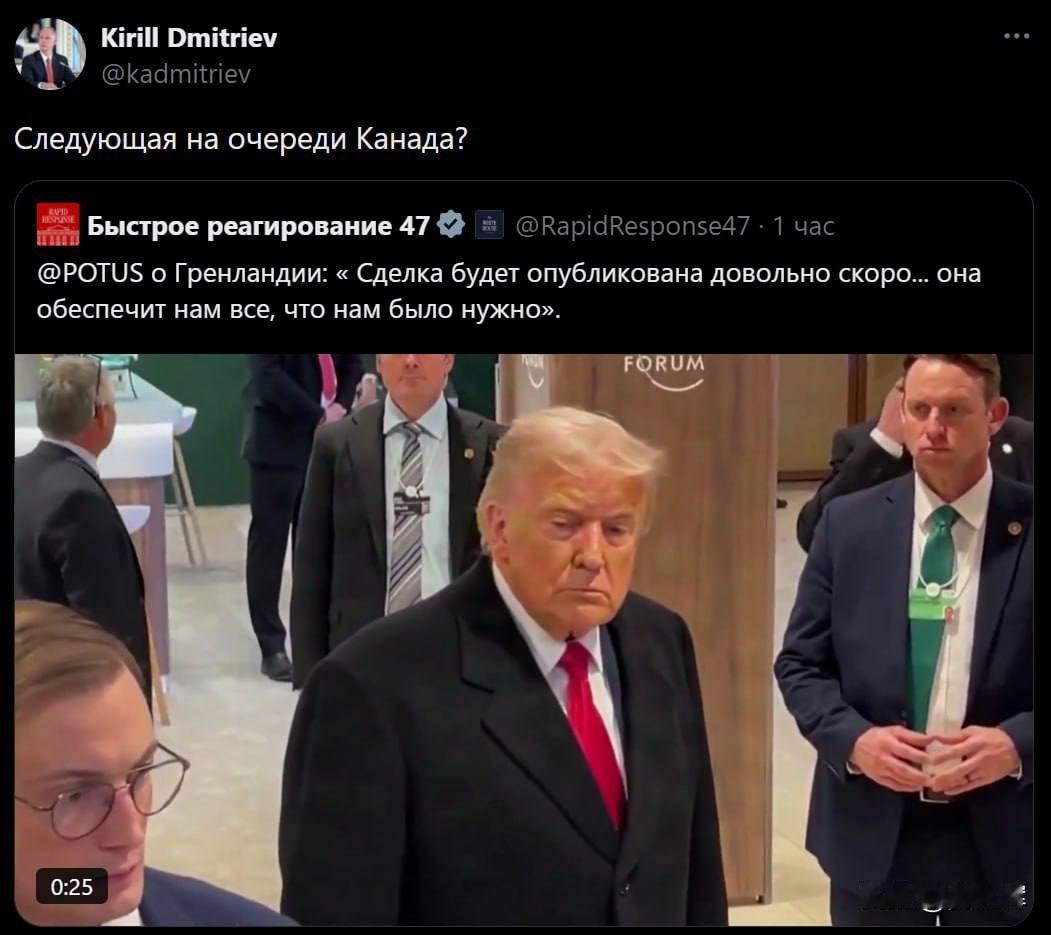 【特朗普下一步或剑指加拿大】俄罗斯总统特别代表基里尔·德米特里耶夫认为,继格陵兰岛相关事宜后,加拿大或将成为美国下一个交易目标。他表示,美方的行事逻辑表明,此类举措的扩张范围将超出北极地区。