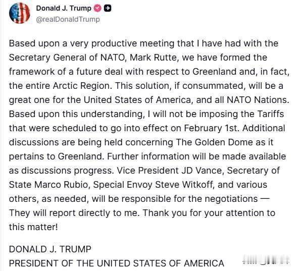 特朗普:格陵兰岛相关交易方案已经敲定 特朗普称,这不仅将是美国的划算买卖,对格陵兰岛当地居民而言同样益处良多。 特朗普表示,“我们将携手推进一项事宜,其影响不仅关乎整个北极地区,亦与格陵兰岛息息相关……这比奥巴马与伊朗签署的核协议要好得多——这项交易将永久生效。” 特朗普同时在社交媒体上透露,他已与北约秘书长吕特就格陵兰岛未来协议框架达成一致,并取消了对支持格陵兰岛的欧盟国家加征关税。