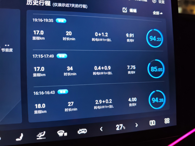 这几天没有回村儿,因为充电桩装到村里了,所以没有去充电,就把宋l当做油车去开。仪表盘的近50km平均能耗显示油耗5.2个。在我的历史行程中可以看到。近7天的行程。比如可以用电的情况下,我开18km。消耗2.9度电,用0.2L油,总共花费4块钱。电量用完了,把它当做油车去开跑17km,消耗0.4度电加0.9L油。费用7.75元。