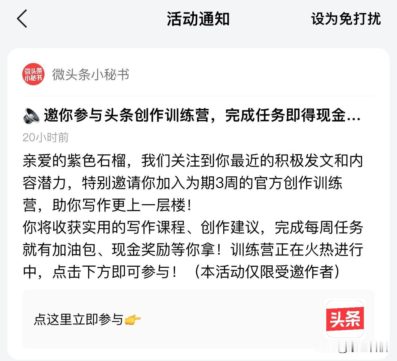 由于我每天坚持不停地写,除了收益不断提升,头条终于看到我的努力了,今天收到一个好消息,那就是头条小秘书给我发信息了! 昨天收到头条小秘书的信息,说头条关注到我最近积极发文和内容潜力,特别邀请我参加为期三周的官方训练营。 收到这个消息真的太开心了,头条终于关注到我的努力了。俗话说:一份耕耘,一份收获,努力终会有回报。期待着通过头条训练营让自己更快成长。 大家有收到头条小秘书的信息吗?