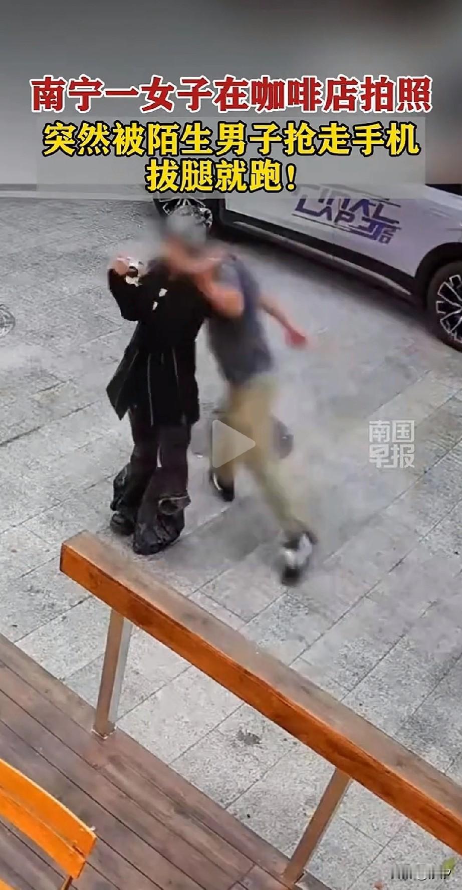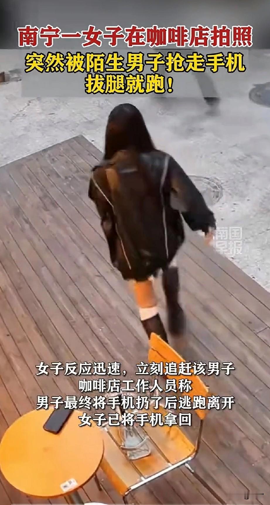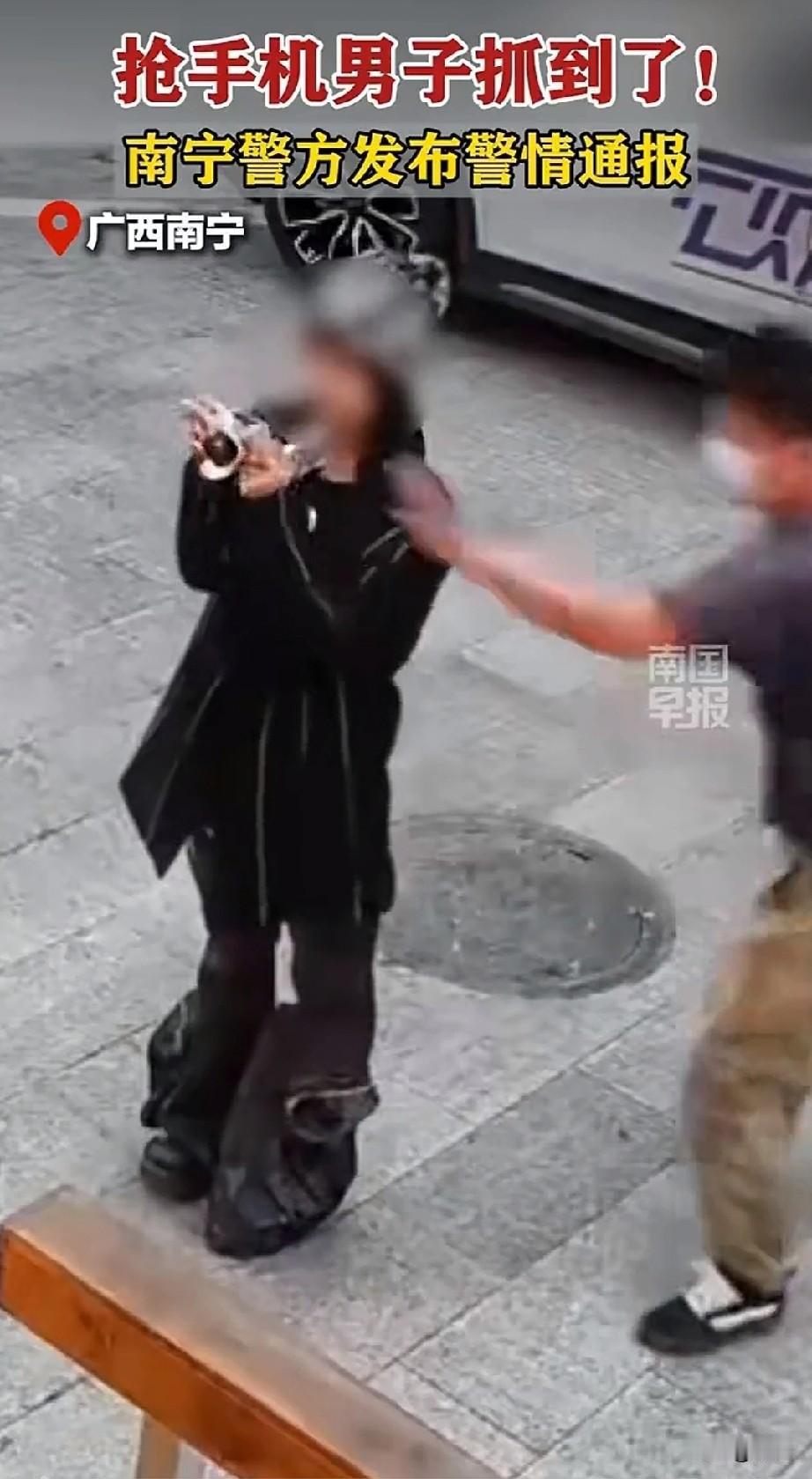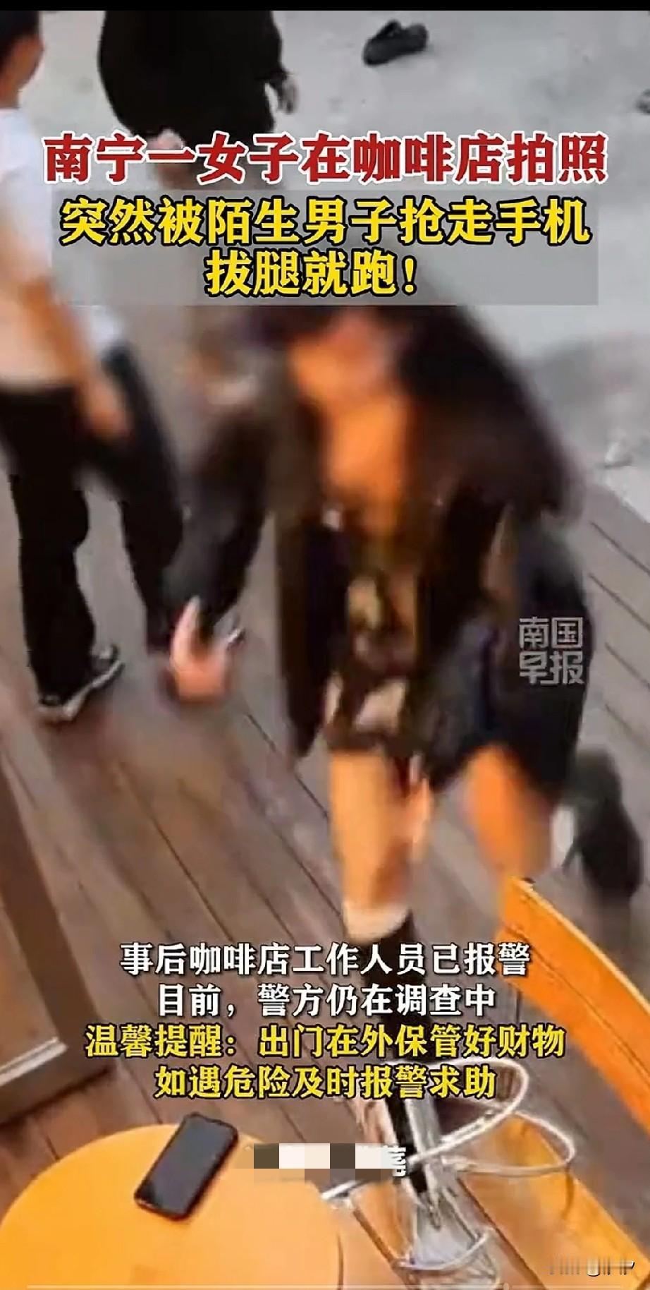 广西南宁抢手机的后续来了,叔叔已经将坏人抓住了,还真是神速! 公告显示事情发生在1月19号18时,两名女子在桂花路咖啡店门口,拍照打卡!结果一名男子戴着口罩悠悠接近! 正当女子按下快门的时候,站在旁边的口罩男突然发力,瞬间将女子的手机拿走! 拍照的女子吓得哇哇大叫,随后转身去追抢手机的男子!坐在咖啡店椅子上的闺蜜吓得站了起来! 刚给他端好咖啡的店员都惊呆了,因为事情发生的太过突然,而且现在当街抢手机让人不可思议… 咖啡店的服务员可能也没见过这个市场,一时间呆愣在原地!抢手机的男子也不知道怎么想的,现在店铺都有监控! 就算抢走了也不可能逃掉,没过几分钟,男子看女子追的比较紧,就把手机扔在附近的绿化带中逃跑了! 丢手机的女子由于追的比较急,一只鞋子落在了咖啡店的门口!随后她们两个人又反了回来, 被抢手机的女子才把鞋子穿上,她的闺蜜这才返回来拿走自己的包包和手机! 她们随机报了警,叔叔很快抓到了犯罪嫌疑人,目前案件还在办理当中!这口罩男真是胆大包天! 大白天在监控下居然抢手机,在如今的时代真的难以想象!大家觉得口罩男为何突然去会去抢手机? 广西 抢顾客事件 追回被偷手机 追回被偷手机 手机被抢夺