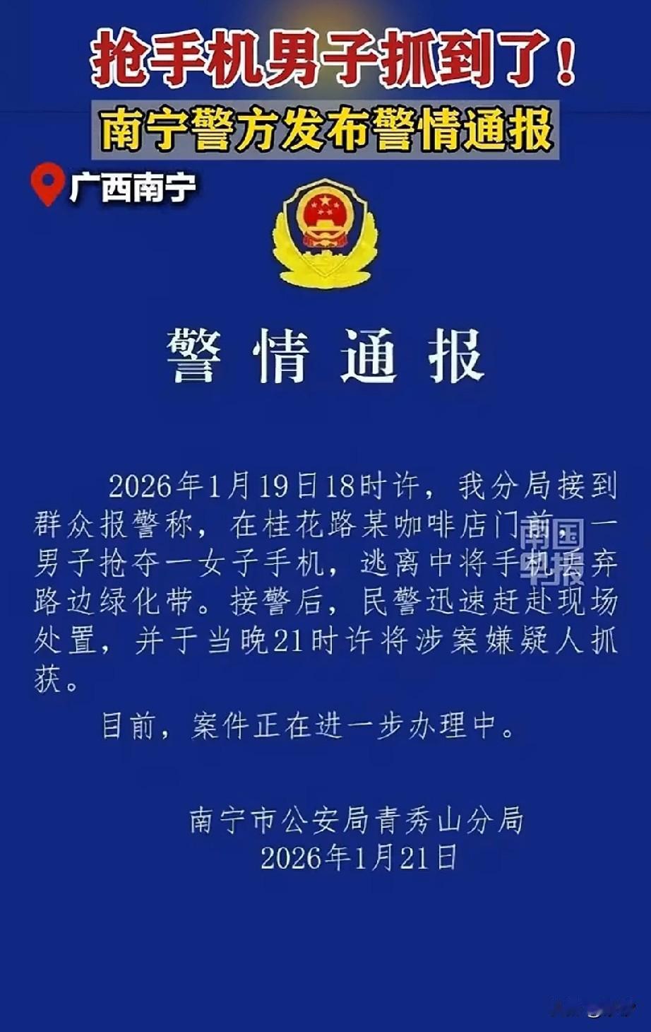 广西南宁抢手机的后续来了,叔叔已经将坏人抓住了,还真是神速! 公告显示事情发生