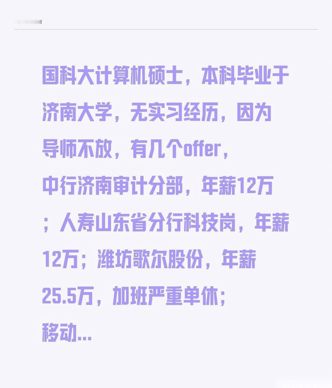 国科大计算机硕士,毕业了,手里捏着五个offer,人却站在了十字路口。 最扎眼的一个,潍坊一家大厂,直接把25.5万的年薪拍在桌上。代价也写得清清楚楚:单休,加班加到没朋友。 转头看另一边,中行、工行、人寿,清一色的国企科技岗。名字听着光鲜,薪水条却很实在,一个12万,一个14万。稳定是稳定,但这个数字,跟他头顶“国科大硕士”的光环,反差有点大。 还有一个移动的offer,不好不坏,卡在中间,15万。 他把这几份录用通知在屏幕上并排打开,鼠标指针来回晃。那串25.5万的数字最亮,也最烫手,像一团火;而那几个12万、14万的,稳稳当当,像一杯温水,解渴,但没劲。 最堵心的是,他其实一张实习经历都没有。不是他懒,是读研时导师一道死命令,不许去。硬生生把他按在实验室,等他再抬头,已经站在了招聘的战场上,手里空空的。 这哪是选工作,这分明是在为导师当年关上的那扇门,付出代价。 是先进狼窝拿命换几年经验和高薪,以后再图上岸,还是现在就一步跨进安稳里,把这口气自己咽下去?