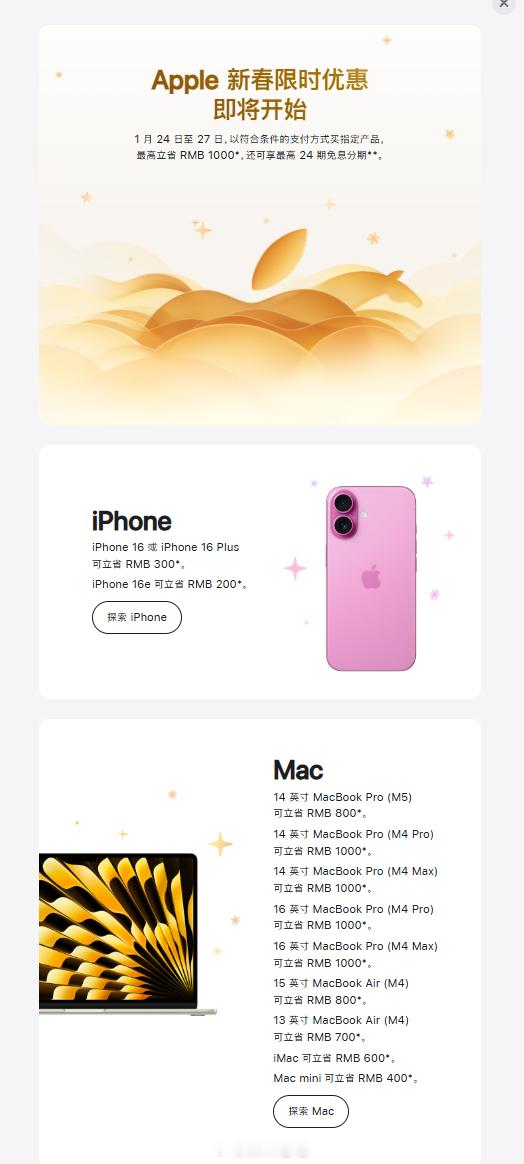苹果官网上线新春限时优惠活动,iPhone 17 系列不参与,倒是 iPhone 16 和 iPhone 16 Plus 降价 300,iPhone 16e 降价 200。Mac 最高立减 1000,iPad 最高立减 400,Apple Pencil 降价 100,Apple Watch 最高立减 300,AirPods 最高立减 300。苹果官网最高降价1000元
