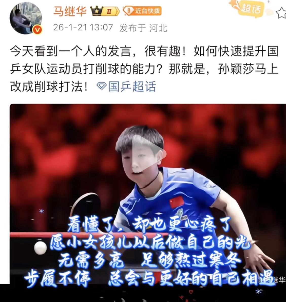 马继华发文:如何快速提升国乒女队运动员打削球的能力?那就是孙颖莎马上改成削球打法! 其实马继华隐晦的表明 国乒女队内部竞争激烈, 如果孙颖莎改变成削球打法, 队友就该努力研究莎莎, 其实不然, 国乒女队还是非常团结的, 莎莎/曼昱多少次并肩作战, 曼昱/蒯曼打女双,蒯曼在采访中 明确表示和曼昱姐学到了许多东西…… 特别是曼昱第一次打败桥本帆乃香后,场内采访就感谢孙颖莎带一个好头,做出了样板! 国乒女队的队员基本都是从小吃住都是一起,感情深厚,比和家人团聚的时间还长! 不要再说这种不团结的言论, 事实大于雄辩, 成都混团期间, 孙颖莎和王曼昱在场外开心的热聊, 大迪和莎莎互动, 一幕幕被记录, 国乒永远是一个团结的大家庭, 大集体,那种氛围不是 粉丝揣测出来的, 就像刘国梁说的, 球迷们吵来吵去, 其实走下赛场, 人家又一起吃饭去了! 运动员常年外出比赛, 更看重队友之间的友谊, 至于打削球, 由于削球技术现在不是主流打法, 但经过桥本,佐藤瞳让 国乒队员频频失利, 相信国乒教练组已经做好应对准备, 但这也是一个过程, 国乒女队新教练上任, 就有一位削球教练, 所以不要太担心, 永远相信国家乒乓球队!