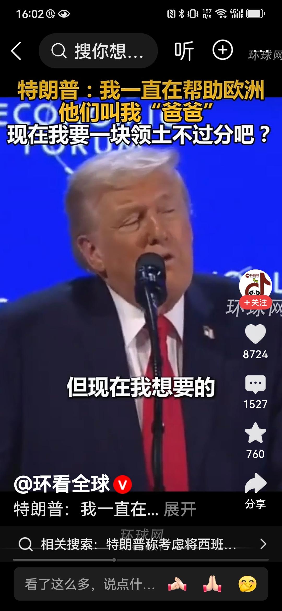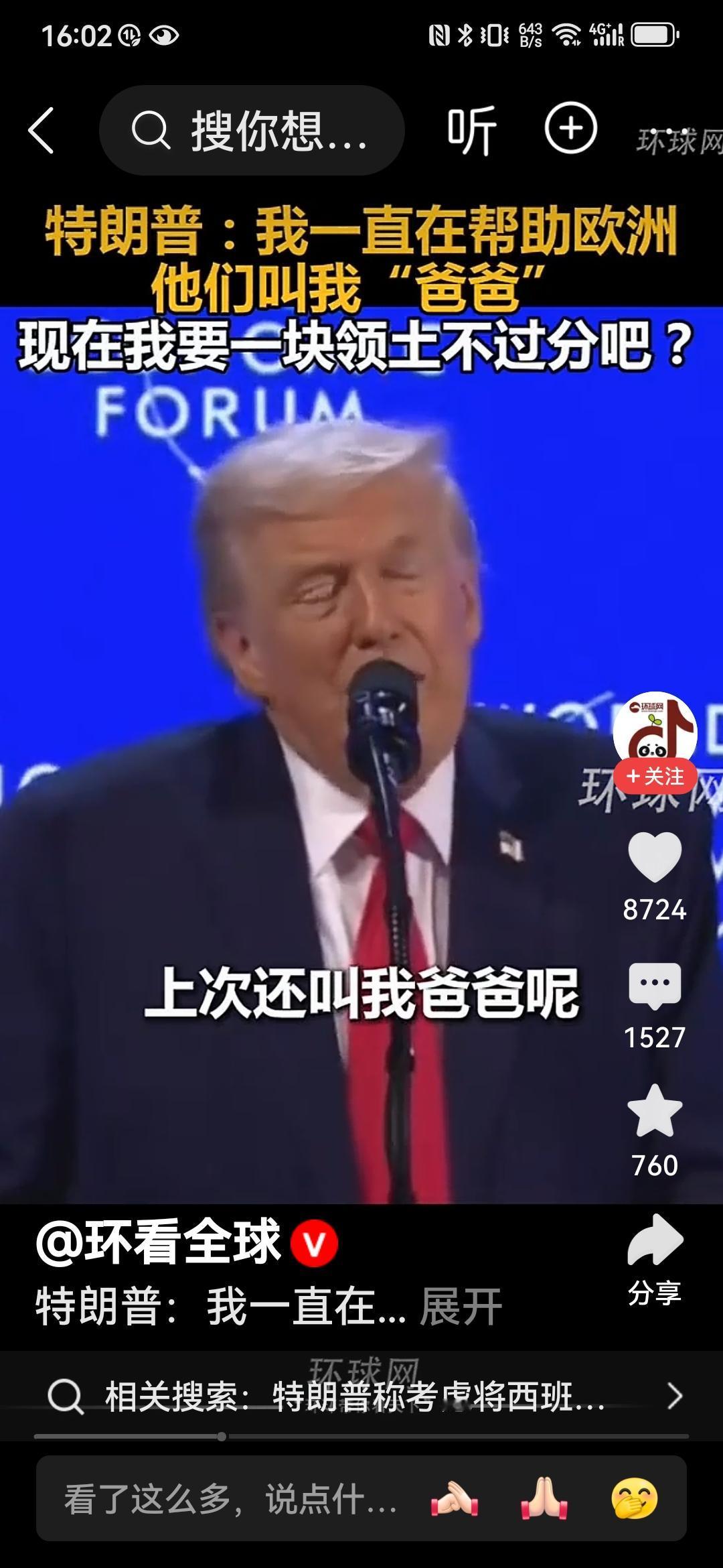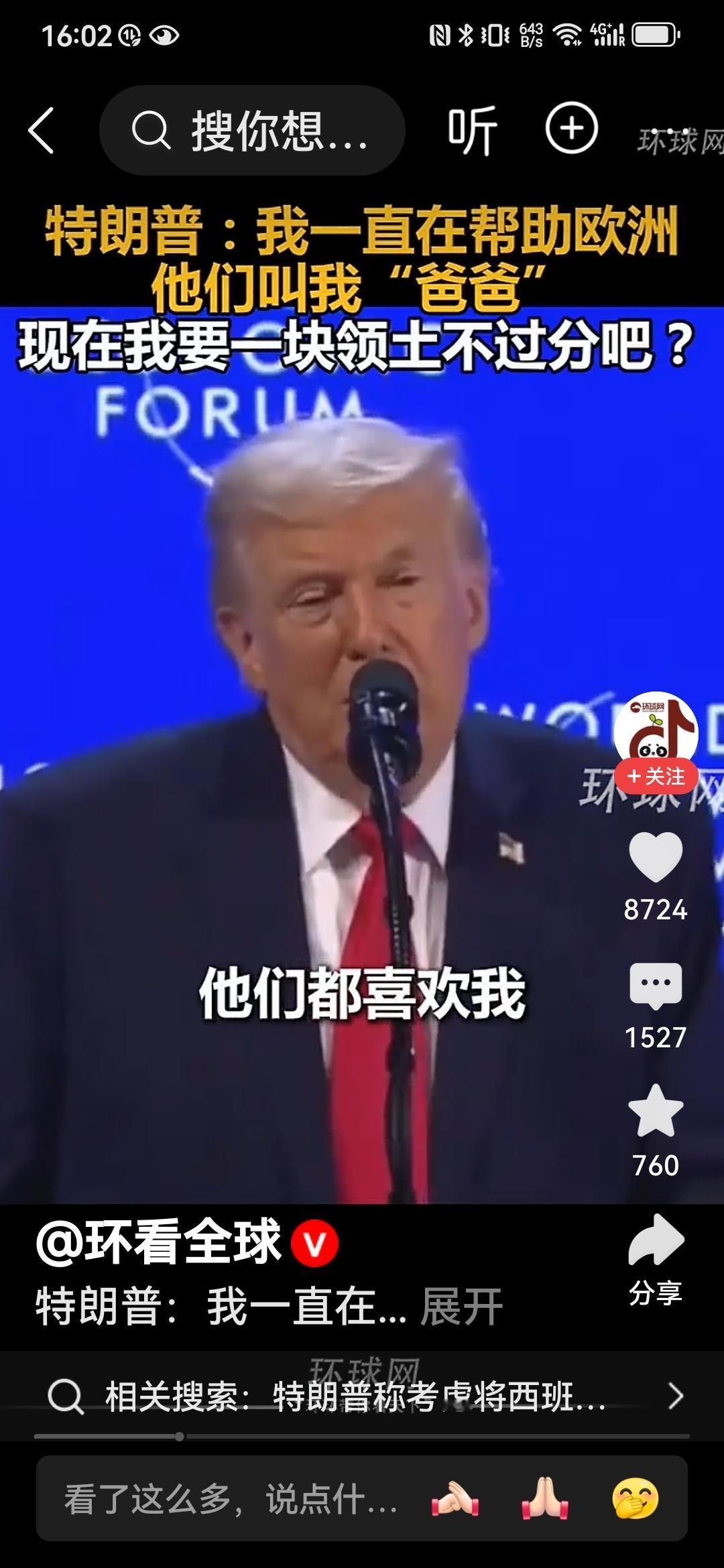 特朗普:爸爸要一块冰冷的土地不过分吧! 特朗普就是特朗普,一边讽刺挖苦着欧洲,一边索要土地,真的是让欧洲人哭笑不得。 在瑞士达沃斯论坛上,这位老兄再一次语出惊人:我一直在帮助欧洲和北约,他们都很喜欢我,上次他们还管我叫爸爸(吕特喊的[笑哭])。那么,我就是想要一块冰冷的、位置偏僻的土地,这不过分吧,这个要求相比于我给与他们的东西相比微不足道。 哈哈,特朗普啊特朗普,真的就把欧洲一干领导人当成自己的儿子们了。欧洲领导们好好想想,你们的爸爸要块土地就像是要块冰激凌一样,只能满足他了吧? 真的不知道吕特和欧洲那帮领导人听了有何感想?