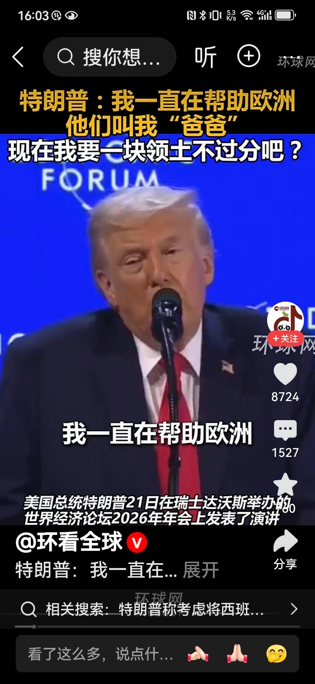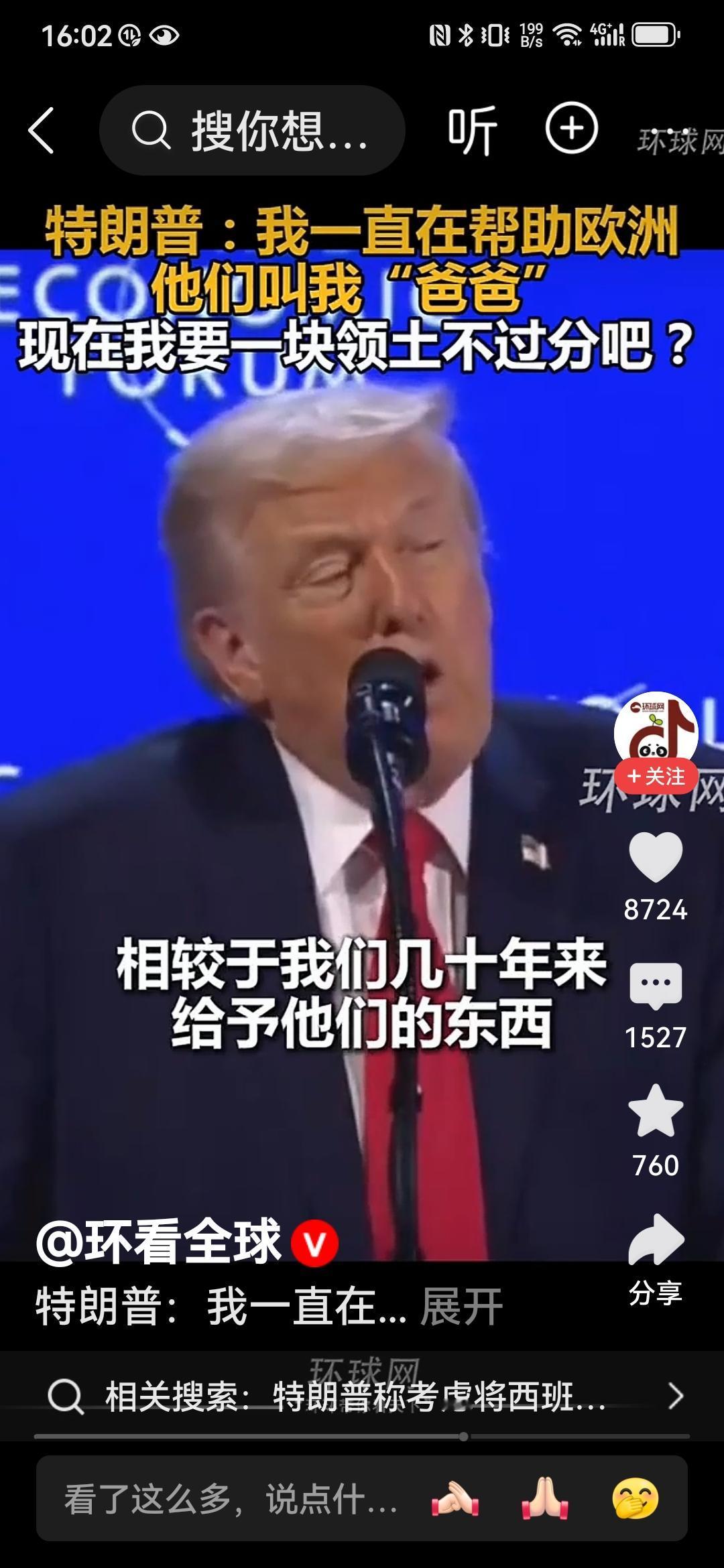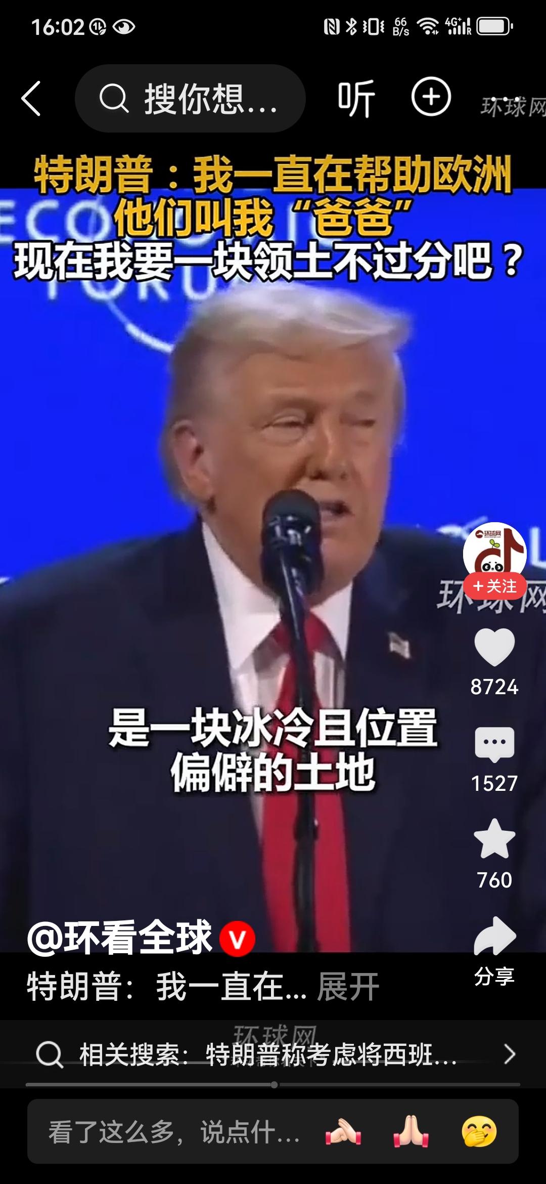 特朗普:爸爸要一块冰冷的土地不过分吧! 特朗普就是特朗普,一边讽刺挖苦着欧洲,一边索要土地,真的是让欧洲人哭笑不得。 在瑞士达沃斯论坛上,这位老兄再一次语出惊人:我一直在帮助欧洲和北约,他们都很喜欢我,上次他们还管我叫爸爸(吕特喊的[笑哭])。那么,我就是想要一块冰冷的、位置偏僻的土地,这不过分吧,这个要求相比于我给与他们的东西相比微不足道。 哈哈,特朗普啊特朗普,真的就把欧洲一干领导人当成自己的儿子们了。欧洲领导们好好想想,你们的爸爸要块土地就像是要块冰激凌一样,只能满足他了吧? 真的不知道吕特和欧洲那帮领导人听了有何感想?