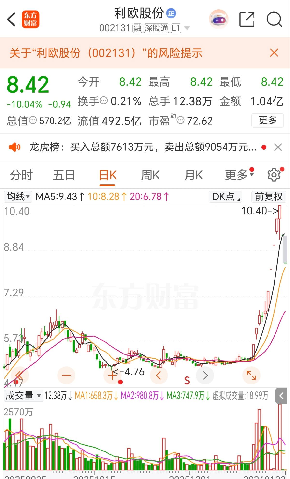 锋龙股份连续17个涨停,一点风险都没有,利欧股份连续5个涨停,就被停牌按死,说风险太大。 这就是有散户投资者和没有散户投资者的区别,没有散户的连续多少个涨停,都没有风险,有的散户,但凡有几个涨停,就是风险太大,需要保护投资者利益。 这种双标做法,已经变得赤裸裸了,所以,那有什么风险,散户多的地方就是风险,就要保护投资者利益。结果像利欧一样被保护了,迎接来了连续跌停,散户想出来都出不来。