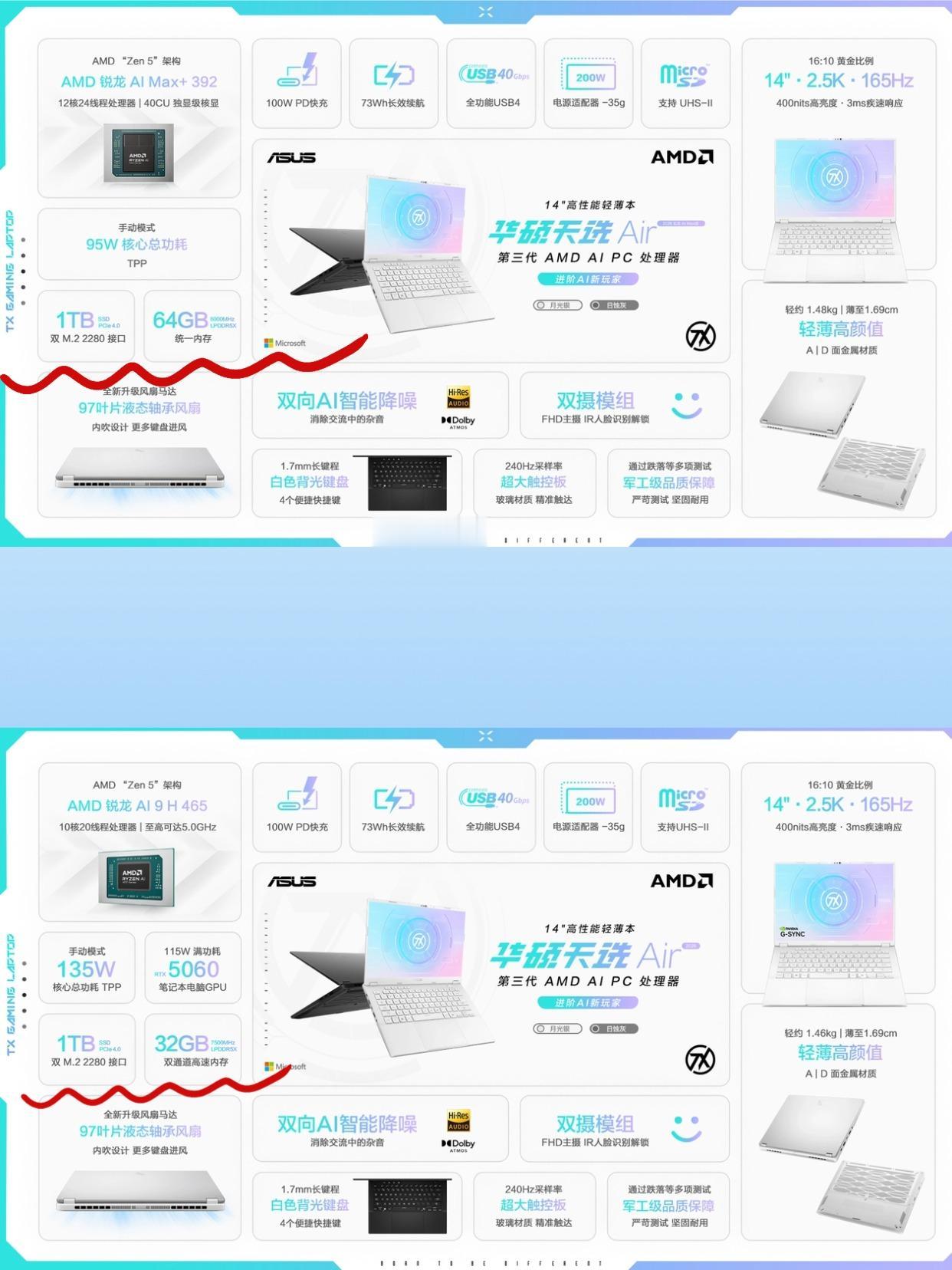 没人觉得华硕天选Air 2026版定价很... 华硕天选Air 2026的价格果然还是没太大的惊喜,首发到手还是要8499起, 看得出内存价格没被打下来。 这次天选Air 2026新上架了两个版本 锐龙 AI Max版,最高给到64GB统一内存,能划48G当显存,成本已经摆在那里了 而独显版则给到了32G+满血RTX5060,也站得住 更别说在14英寸性能小钢炮这个赛道,天选Air系列几乎找不到对手 1.46kg、1.69cm薄,还塞进标压U+高功耗显卡, 这放在以前谁能想得到!! 至于两个版本怎么选,大家根据需求对号入座就好:👇 1️⃣AI Max版适合需要大内存跑AI/多任务的人,本地大模型、编程、重度办公很舒服,而且集显性能也和4060接近,日常用来玩玩游戏感觉也不错。 2️⃣独显版就是为游戏和创作直接拉满,115W的5060加上2.5K 165Hz屏,性能释放到位。 作为老用户,我反正是觉得这代没啥可太挑剔的,质感依然在线,而且接口全、散热堆料更足,续航也给到73Wh+PD快充。如果你想要一台真正能打又能带的14寸全能本,8499起步其实挺能打。 这个价,你们冲吗?还是再等等?👇 华硕天选Air 2026 轻薄本 全能本 数码新品 AMD锐龙 RTX5060 数码新品