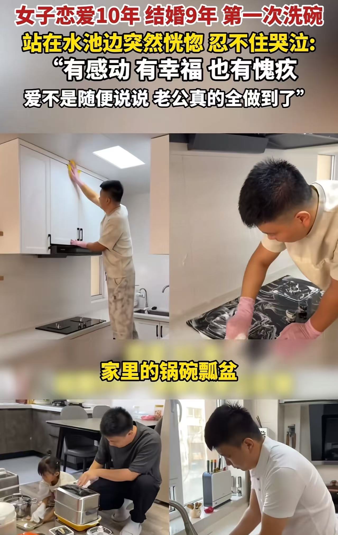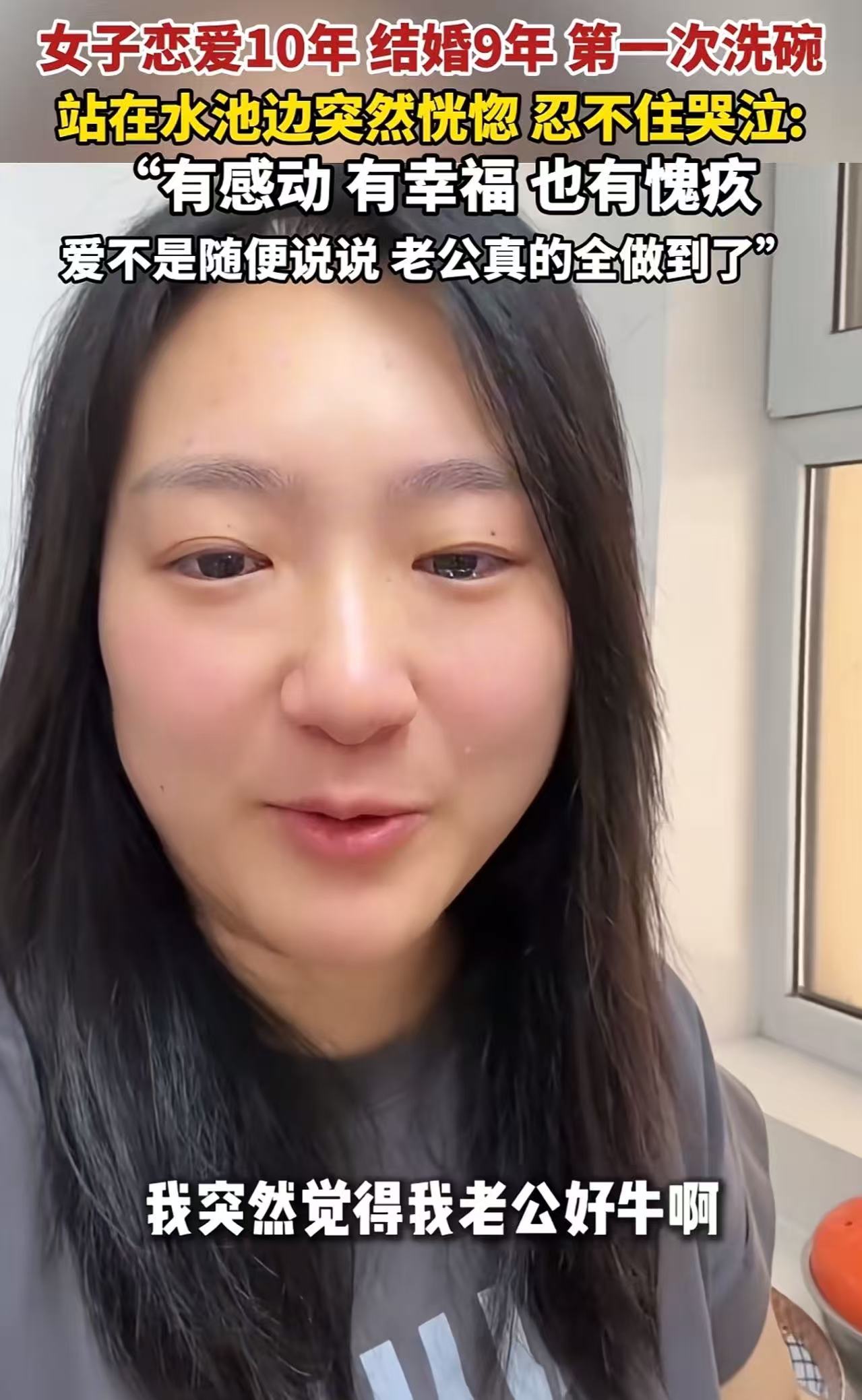女子恋爱10年,结婚9年,第一次洗碗。站在洗碗槽旁边突然恍惚,忍不住哭泣:“突然觉得我老公好牛,结婚这么久没让我洗过一次碗。有感动,有幸福,也有愧疚,爱不是随便说说,老公真的全做到了!