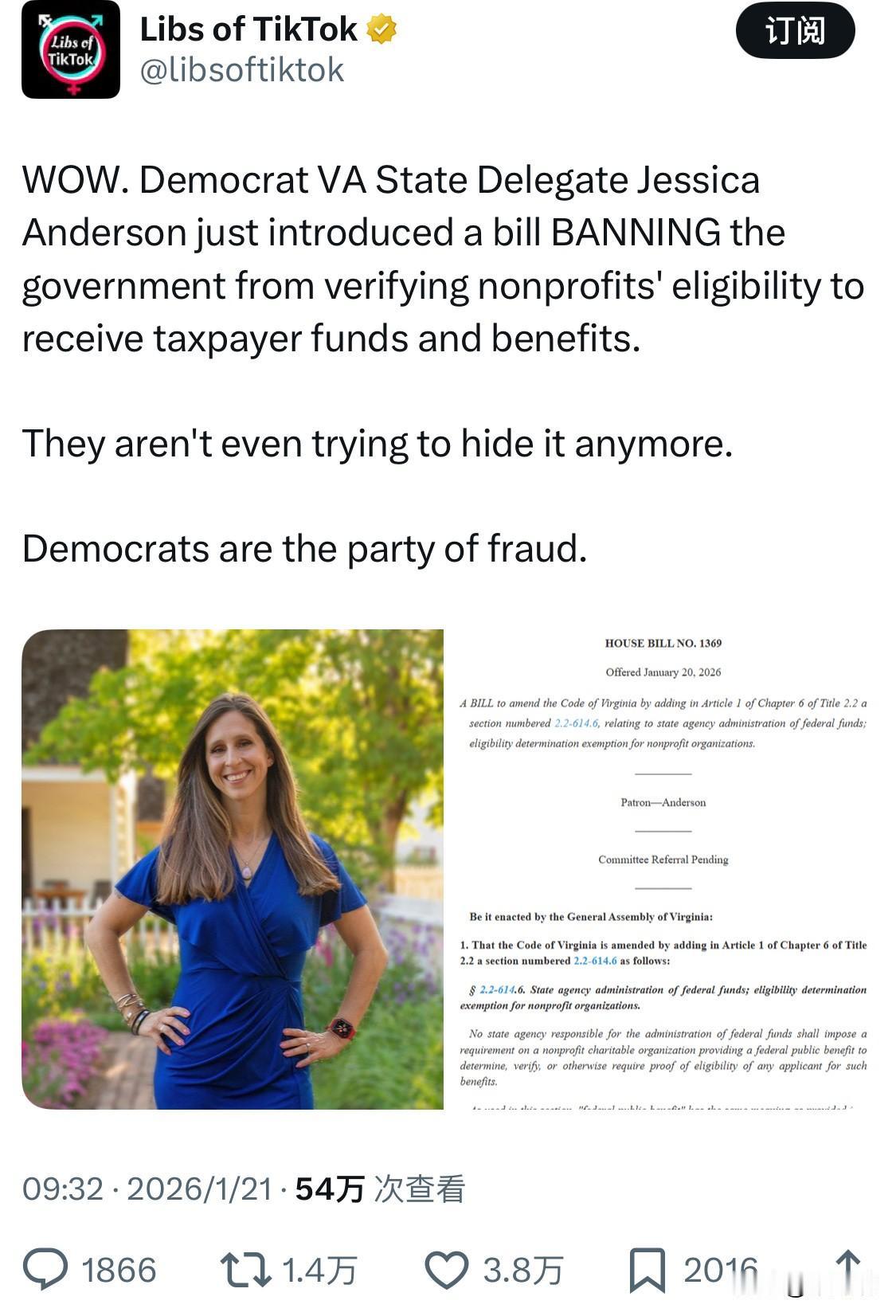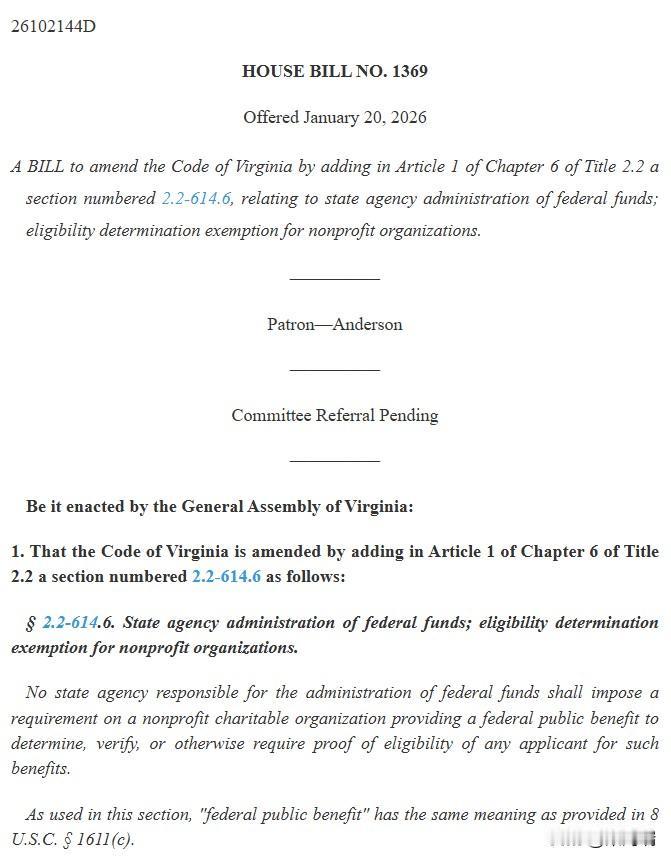 民主党退伍军人事务部代表杰西卡·安德森刚刚提出了一项法案,禁止政府核实非营利组织获得纳税人资金和福利的资格。 他们甚至不再试图隐藏它了。 民主党人是欺诈的一方。 弗吉尼亚州众议院第1369号法案(HB 1369)旨在禁止负责管理联邦资金的州机构要求提供联邦公共利益的非营利慈善组织确定、核实或以其他方式要求申请人提供资格证明。 该法案于2026年1月20日提交,目前尚待委员会审议。 该法案的主要内容和当前状态摘要如下: 法案名称: 弗吉尼亚州众议院第1369号法案 (HOUSE BILL NO. 1369)。 提案人: 安德森 (Patron—Anderson)。 核心条款: 在《弗吉尼亚州法典》中增加 § 2.2-614.6,规定任何负责管理联邦资金的州机构不得要求提供联邦公共利益的非营利慈善组织对申请人进行资格审查或验证。 状态: 2026年1月20日提交至众议院,目前尚待委员会审议。