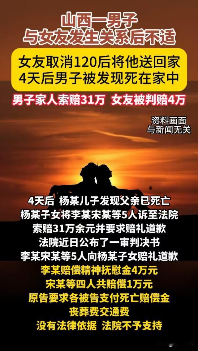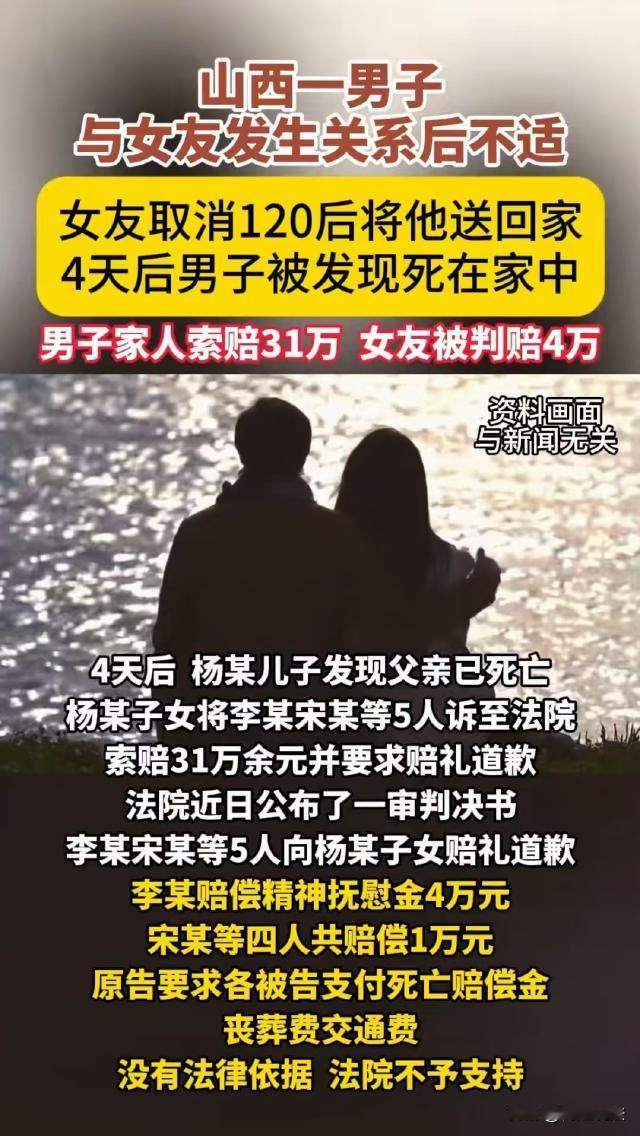山西太原,66岁男子去女友家和她发生了关系后,情绪一激动失去了意识,女友在朋友的提醒下打了120,可过了一会女友又说男朋友醒了,不用来了,和朋友一起将男子送回他自己家。4天后,男子的家属发现男子在家里已经离世,火化完后,家属查看监控,无意中看到女友将他送回的画面,男子家属气得将女友和她的四个朋友一同起诉了。 据观威海报道,66岁的杨某丧偶多年,儿女都有自己的家庭后,杨某生出了再找个伴的念头。 后来,独居多年的杨某认识了女友李某,两人虽然没有同居,但是经常在一起相处。 2023年5月7日上午,杨某去李某家找她,两个人发生了关系后,杨某感觉胸口有点闷,过了一会,他竟然直接失去了意识。 李某心慌意乱,不知道是怕担责,还是怕花钱,她竟然没打120,而是给几个信得过的朋友打了电话。 朋友宋某来了后,立即提醒李某:赶紧打120啊! 李某这才打了120,说明了杨某的情况。对方告诉她不要移动杨某,等他们来了处理。 可没多大会,李某再次联系急救人员,说杨某已经醒了,不需要急救了。 随后,李某和四个朋友一起,将杨某送回了他自己家,五人直接离开,也没有告诉杨某的家属。 四天后,杨某的儿子联系杨某,却一直没有得到回复,杨某的儿子不放心,去杨某家里看了看,结果这才发现杨某人都僵了。 杨某的儿子以为杨某是突发意外离世,通知家属一起办了后事,将杨某送去火化了。 可火化完后,杨某的儿女却觉得不对劲,杨某身体一直不错,怎么会突然离世呢? 儿女们去小区里调取了监控,看见了四天前李某五人将杨某送回家,又匆匆忙忙离开的画面。 杨某的家属怀疑,杨某根本不是在家里突发意外,而是在李某家就出事了!于是立即报了警。 依据《刑事诉讼法》第一百一十二条,对于报案、控告、举报和自首的材料,应当按照管辖范围,迅速进行审查,认为有犯罪事实需要追究刑事责任的时候,应当立案;认为没有犯罪事实,或者犯罪事实显著轻微,不需要追究刑事责任的时候,不予立案。 可是,此时杨某的遗体已经火化了,其死因不明,也没有证据证明李某等人的行为与杨某离世存在直接、明确的因果关系。 也就是说,没有证据表明李某等人存在犯罪行为。 因此,检方最终做出了不予起诉决定。 杨某的儿女只好改变方向,他们认为,杨某明明身体不适且很严重,李某等五人却没有尽到救助义务,最终导致杨某离世,李某五人存在过错。 根据《民法典》第一千一百六十五条规定,行为人因过错侵害他人民事权益造成损害的,应当承担侵权责任。 杨某的儿女认为,李某和当天帮忙送回杨某的四个朋友,都存在不同程度的过错,应当赔偿丧葬费、死亡赔偿金等,共计31万余元,并向他们赔礼道歉。 经审理认为,《民法典》中侵权责任的构成要件包括侵权行为、损害后果、因果关系以及过错。 由于杨某遗体已火化,杨某的家属没有足够证据,证明李某等人的行为与杨某的离世存在直接的因果联系。 因此,一审认为,对于死亡赔偿金、丧葬费等诉求,缺乏因果关系证据不予支持。 虽然没有证据证明杨某的离世与李某等五人存在法律上的因果关系,但李某明明知道杨某情况危急,却没能采取正确的救助方式,甚至直接将他送回家,连家属都没通知。 朱某等四人在协助李某送杨某回家时,也没有尽到善良互助义务,有违公序良俗。 公序良俗是公共秩序与善良风俗的简称,它要求民事主体的行为不得违背公共秩序和善良风俗。 《民法典》规定,当他人处于危险状态时,一般公民应当尽到善良互助的义务。 在杨某病危时,李某没有采取正确的救助措施,朱某等四人在协助送返过程中,同样没有尽到善良互助义务,他们的行为违背了公序良俗原则。 所以,虽然五人不用承担丧葬费等,但根据《民法典》中规定,因侵权行为致使他人精神受到损害的,受害人可以要求精神损害赔偿。 最终,一审认为李某等人的行为违背公序良俗,对死者子女造成了精神伤害。判李某赔偿精神抚慰金4万元,其余四人各赔偿2500元,五人向杨某家属赔礼道歉。