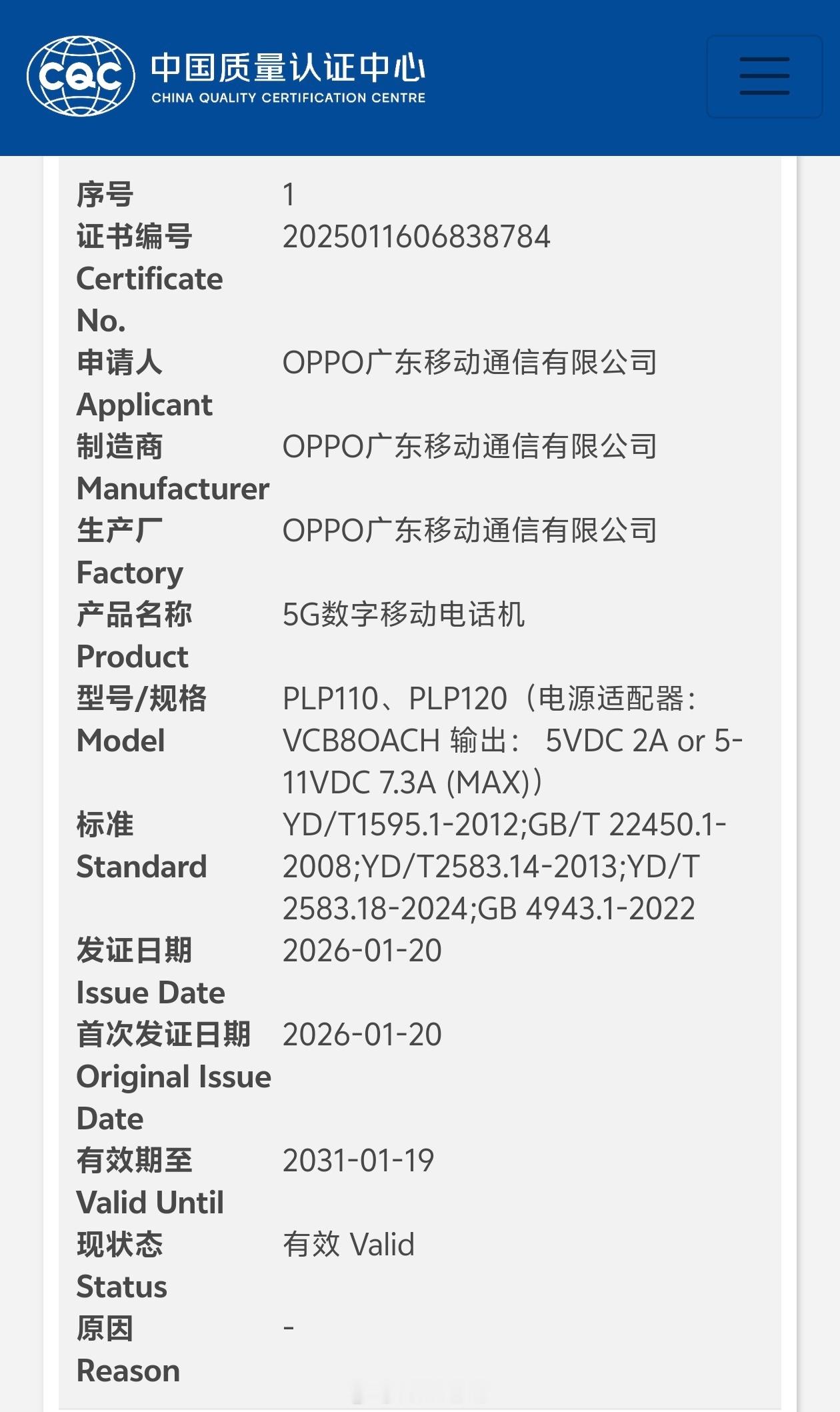 OPPO Find N6 通过国家质量认证,型号 PLP110 / PLP120,应该是对应标准版和卫星版,支持 80W 快充,6 开头电池,骁龙 8 Elite Gen5 处理器,2 亿像素镜头,重量 225g±,支持手写笔 。春节前发布肯定是不可能的,要到春节后了。