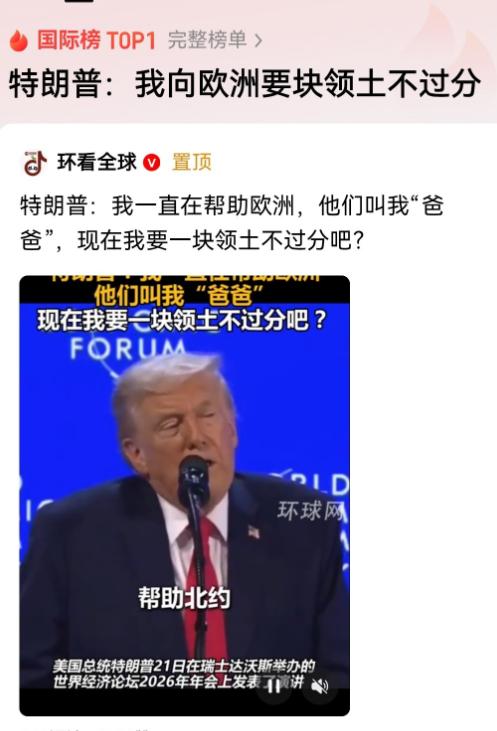 特朗普简直是杀人还诛心啊!居然在大会上,当着下面无数代表的面,公开表示。   我一直在帮助欧洲,而欧洲一直喊我爸爸,现在要块领土不过分吧?   此言一出,全球哗然。   特朗普的“领土野心”早有端倪,2019年他首次提出购买格陵兰岛,被丹麦首相弗雷泽里克森斥为“荒谬”。   2026年1月,他变本加厉,以“维护全球安全”为名,要求丹麦及欧盟八国“回报美国”,若不配合格陵兰岛“收购”,将对丹麦、挪威等国加征关税,从2月1日起征收10%,6月后飙升至25%。   更危险的是,他暗示不排除动用武力,副总统万斯甚至威胁“欧洲应认真对待特朗普的言论”。   丹麦的反应堪称坚决,首相弗雷泽里克森在社交媒体强硬回击:“格陵兰是格陵兰人的,任何政治或军事武力都无法改变边界,”丹麦国防部宣布,若美国行动,士兵可“先开枪后请示”,并紧急采购16架F-35战斗机加强北极防御。   欧洲多国迅速站队:挪威称“格陵兰是丹麦不可分割的一部分”,法国、德国启动反胁迫工具,欧盟委员会主席冯德莱恩强调“主权与领土完整是国际法基石”。   这场闹剧的本质是地缘战略与资源争夺,格陵兰岛位于北极航道枢纽,随着冰川融化,其战略价值飙升:已探明稀土储量占全球11%,石油、天然气资源总价值超万亿美元。   特朗普的“新门罗主义”逻辑下,美国试图通过控制格陵兰岛主导北极航道,遏制中俄在北极的影响力。   然而,这种“交易型外交”正反噬美国自身,北约内部信任崩塌,德国宣布加速推进“欧洲自主防务体系”,加拿大、爱尔兰重启对华合作,法国《世界报》更直指“跨大西洋联盟精神已死”。   更深层的危机在于国际规则的失序,特朗普将诺贝尔和平奖与领土扩张挂钩,编造“中俄觊觎格陵兰”的虚假叙事,暴露其“强权即真理”的霸权思维。   这种逻辑若得逞,将开创“以关税逼割地”的恶劣先例,彻底颠覆二战后以联合国宪章为基础的国际秩序。   丹麦议员警告“美国正将欧洲推向中国”,恰是欧洲对美国单边主义的本能警惕,当盟友安全威胁来自盟友本身,战略自主成为必然选择。   特朗普的“领土扩张”闹剧,本质是霸权主义对多极化趋势的垂死挣扎,格陵兰岛事件证明,单边主义无法持久,唯有尊重国际法、平等协商才能解决争端。   欧洲的反抗表明,国际社会对“美国优先”的容忍度已临界,中国始终主张通过和平对话解决分歧,反对任何形式的霸权主义,未来,全球治理需构建更公平的规则体系,强化多边机构作用,防止“强权逻辑”侵蚀国际秩序。   对欧洲而言,战略自主不仅是生存所需,更是维护多极世界的责任,对美国而言,放弃“美国例外”,回归国际规则,才是避免孤立的正途,格陵兰的冰川终将融化,但人类对和平与正义的追求,必须如北极星般永恒指引方向。