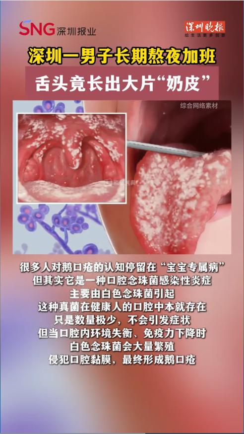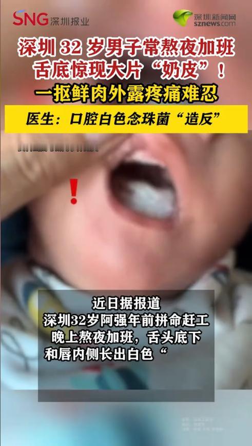 “太恐怖了!”近日,广东深圳,一名32岁男子为赶项目连续半个月熬夜加班,拼命赶工,这天照镜子时才发现舌底突然长出大片白色“奶皮”,而且用手一抠就鲜肉外露、渗血不止,疼得连咽口水都像吞刀片!网友:别吓我啊! 都说年轻人熬夜加班是常态,但并不是所有透支身体的代价都能轻易扛过去,只要长期作息紊乱,免疫力就会亮起红灯,要是再不重视,小毛病也可能变成大麻烦。 据媒体1月21日报道,男子年前为了冲项目业绩,连续半个月泡在公司,几乎每天盯着电脑到凌晨,咖啡灌了一杯又一杯。平时身体一向硬朗的他,这天早上起来后吐了口口水,就感觉舌头像被针扎一样疼,而且口水上沾着一团白色的膜。 他慌慌张张掏出手机照镜子,只见舌底和嘴唇内侧全是一层厚厚的白膜,像粘了块没化开的奶皮,用指甲轻轻一刮,就露出底下鲜红渗血的创面,疼得他倒抽冷气,连喝水都要分三次咽,更别说吃饭了。 他赶紧冲到医院口腔科,医生用棉签一碰那层白膜就掉了,底下的创面还在渗血,当场确诊为口腔白色念珠菌感染,也就是“成人版鹅口疮”。 医生解释,罪魁祸首正是他长期熬夜导致免疫力崩盘,让口腔里原本的真菌趁机“造反”,引发了感染。网友看后直呼,真是拿命赚钱。也有网友表示,吓得再也不敢熬夜了,还是赶紧睡吧。 信息来源:《深圳一男子长期熬夜加班,舌头竟长出大片“奶皮”》深圳晚报