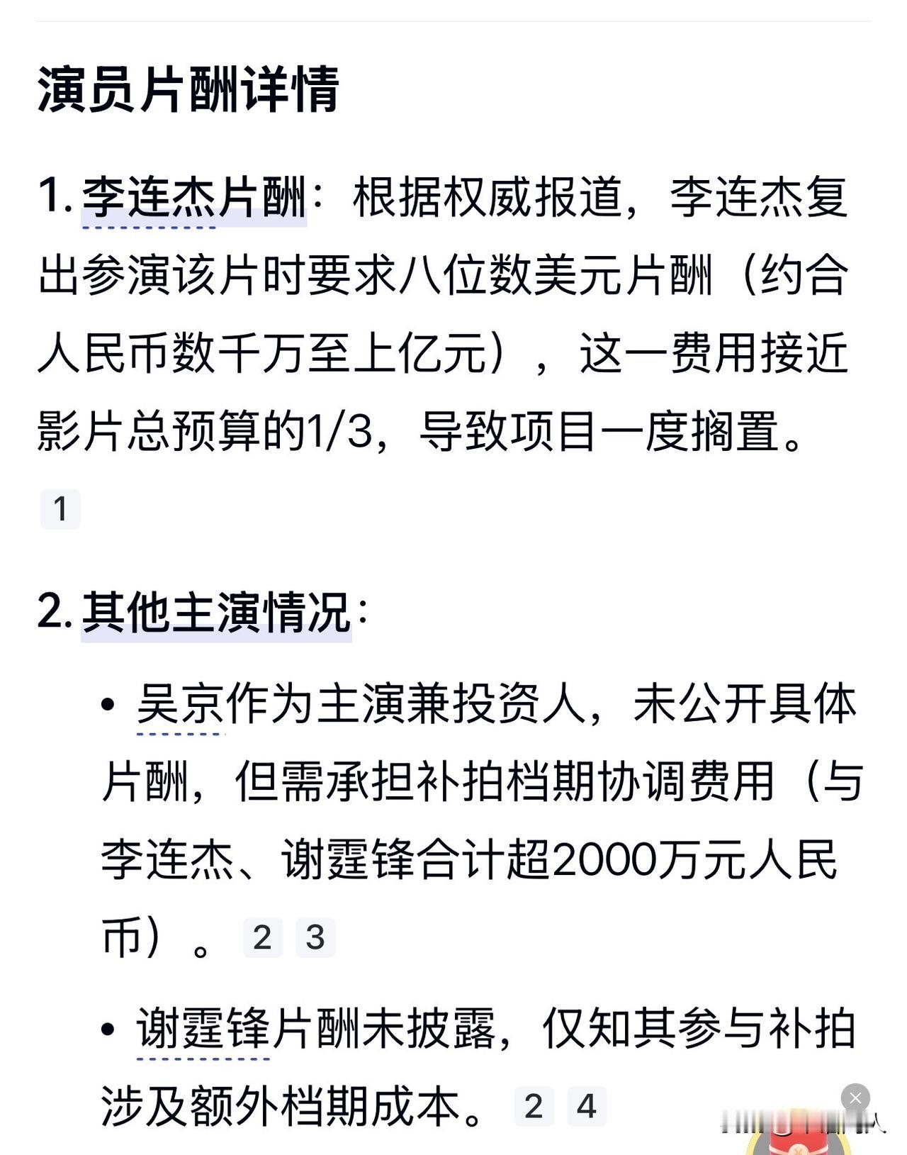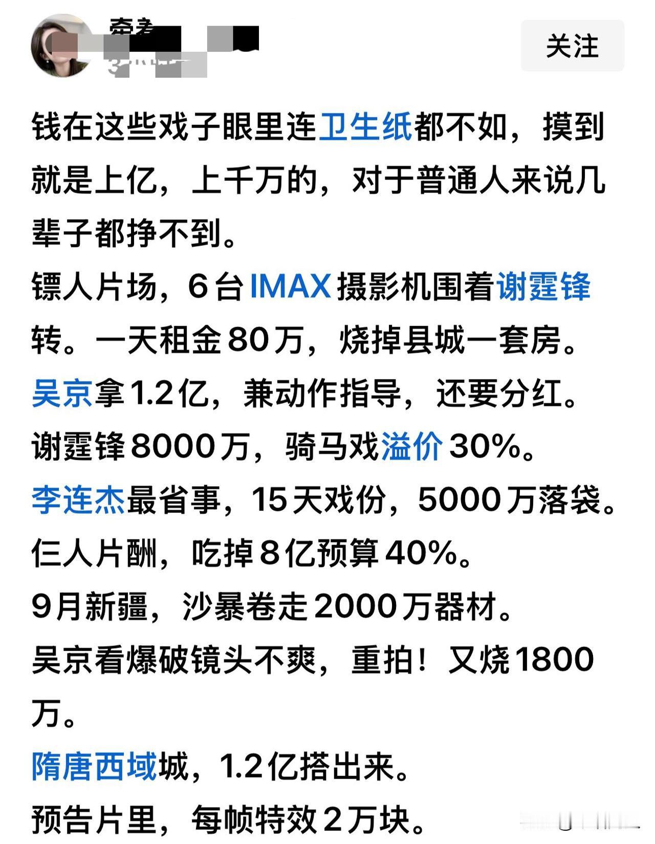 《镖人》的主要演员可能涉嫌集体违规!这是什么情况? 看到一组数据《镖人》的主要演员吴京拿1.2亿还要分红,谢霆锋8000万,李连杰5000万,仨人片酬,吃掉8亿预算的40%。 这个数据是一个网络作者在他的微头条里披露的,如果是真的,那么这些演员是不是违反了国家的相关规定呢? 我查了一下资料,2017年9月:中国广播电影电视社会组织联合会电视制片委员会、演员委员会等四家机构联合发布了《关于电视剧网络剧制作成本配置比例的意见》,首次明确规定演员总片酬不得超过制作总成本的40%,主要演员片酬不得超过总片酬的70%。 而且2018年和2022年又先后出台了限制演员高薪的文件,白纸黑字就摆在那里,而且相关的宣传也很广泛到位,他们为什么还这么做? 演员高薪酬的危害主要有,扭曲社会价值观,加剧社会贫富差距与矛盾,挤压影视制作成本,降低作品质量,阻碍行业健康发展与人才梯队建设,诱导青少年盲目追星。 看看正因为存在这么多危害性,国家才出台了限制演员高片酬的规定,那些违反相关规定拿高片酬的演员,是不是应该按照相关规定进行处罚,以儆效尤呢? (以上演员片酬数据,一家权威进行了报道,但没透露详细信息,请看下面的图片)