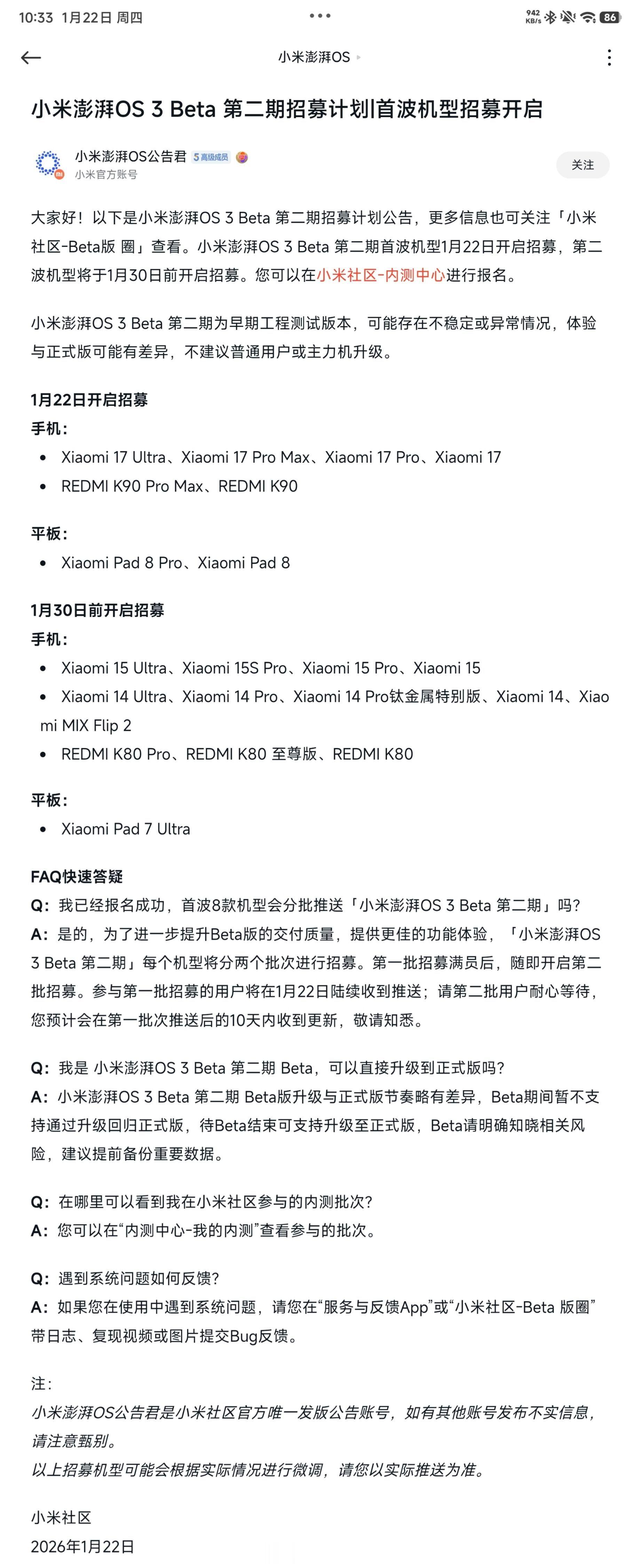 澎湃 OS 3 Beta 第二期招募来了,因为是早期工程测试版本,可能存在不稳定或异常情况,不建议你们使用主力机升级。支持的机型:小米 17 系列、REDMI K90 系列,小米 Pad 8 Pro 系列(第一批)小米 15 系列、小米 14 系列、小米 MIX Flip 2、REDMI K80 系列,小米 Pad 7 Ultra(第二批)