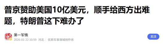 普京赞助美国10亿美元,顺手给西方出难题,特朗普这下难办了   当地时间 21 日,普京一席看似闲扯的表态,直接把国际政坛搅成了 “一锅粥”,前脚调侃美国觊觎格陵兰岛是 “老殖民套路”,后脚就给特朗普扔出 “10 亿美元赞助大礼包”,可这钱要从美国冻结的俄资产里出。明眼人一看就懂,这哪里是示好,分明是给特朗普和西方挖了个深不见底的坑。   先说说格陵兰岛这出 “前戏” 有多狠。普京对着媒体轻描淡写:“美国想吞格陵兰岛,跟我们没关系,但丹麦把那儿当殖民地折腾,可不地道。” 这话听着像看热闹,实则刀刀见血。   要知道特朗普对格陵兰岛的执念早不是秘密,2019 年就喊着要买,2024 年又重提这茬,还提名亲自己的大使去丹麦铺路。格陵兰岛可不是普通小岛,北极航道的关键节点、美军图勒空军基地所在地,冰川下还藏着数不清的矿产,对美国控制北极的战略意义堪比南海之于中国。   普京偏要提 “殖民地”,一下就戳破了美国的遮羞布。丹麦刚砸 15 亿美元加强格陵兰岛防务,嘴上说跟美国无关,实则就是防着特朗普强买。更妙的是,普京故意提 “美丹有领土交易传统”。   1917 年丹麦把西印度群岛卖给美国成了美属维尔京群岛,这茬一翻,等于把特朗普的 “购岛梦” 定性成 “新殖民主义”,让丹麦在国际上坐立难安,也给欧盟盟友递了个话:看看你们的 “大哥” 在干啥。这波借力打力,把美欧本就紧张的关系又撕开道口子。   没等西方缓过神,普京又甩出第二张牌:同意加入特朗普搞的加沙 “和平委员会”,还愿意掏 10 亿美元会费。   特朗普刚开始可能还窃喜,觉得拉拢到了俄罗斯这个 “重量级玩家”,可听到付款条件当场就得懵,“钱从你们冻结的俄资产里扣”。这哪是赞助,分明是给美国摆了道 “政治单选题”。   要知道美国冻结的俄资产可不是小数目,2022 年拜登就下令冻结俄在美全部资产,光被制裁的俄银行资产就超 1 万亿美元。去年 12 月美国刚把俄富商马洛费耶夫的 540 万美元转给乌克兰,俄外交部骂这是 “公然抢劫”,放话要 “对等反击”。   现在普京要特朗普从冻结资产里掏钱,等于逼着美国承认 “这些资产还是俄罗斯的”,要是同意,之前宣称 “没收俄资产合法” 的说法就成了自抽耳光,以后再想转资产给乌克兰都名不正言不顺;要是不同意,特朗普的 “和平委员会” 刚被法国拒绝,俄罗斯这根 “救命稻草” 又抓不住,所谓的 “美式和平” 就是个笑话。   更绝的是,这 10 亿还成了照妖镜,把西方的虚伪扒得一干二净。特朗普的 “和平委员会” 本就不怀好意,章程里写着要搞 “全球冲突地区介入权”,摆明了想架空联合国搞 “美式小圈子”。   马克龙早就看穿了,直接拒绝加入,怕坏了联合国框架。普京这会儿带着 “钱” 要加入,等于把这个委员会的 “霸权本质” 摆到了台面上:你不是要和平吗?我给钱,但得用你抢我的钱给,接受就是认怂,不接受就是承认委员会是幌子。   特朗普这下是真难办了。对内,美国国会刚通过法案允许没收俄资产援乌,要是敢把冻结资产给 “和平委员会”,保守派得骂他 “通俄”,自由派得说他 “践踏法律”。   对外,欧盟盟友本就对美国冻结资产的做法有分歧,法国、德国私下都担心 “开了抢劫的头”,普京这一闹,等于逼着盟友选边站,要么跟美国一起丢脸,要么跟美国划清界限。难怪有媒体说,这 10 亿是 “史上最贵的外交陷阱”。   其实普京这两步棋,早把算盘打得叮当响。俄罗斯被西方孤立这么久,正好借加沙委员会破局,哪怕只是露个脸,也能重回大国博弈牌桌,还能顺便跟特朗普聊聊俄乌冲突的筹码。   而挑动格陵兰岛问题,更是精准踩中了美欧的裂痕:美国想拿格陵兰岛当北极支点,欧盟怕被美国卖了,俄罗斯正好坐山观虎斗,顺便保住自己的北极利益。这哪里是 “看热闹不嫌事大”,分明是教科书级别的 “借力打力”。   现在西方阵营已经暗流涌动。丹麦外交部紧急召见美国大使,要求 “澄清购岛传闻”;法国媒体直接骂特朗普的委员会是 “霸权实验室”;连美国自家媒体都吐槽 “普京把特朗普玩得团团转”。   最重要的是,美国司法部还在吹嘘 “没收俄资产不会是最后一次”,普京反手就用 10 亿提案,把 “抢劫” 的帽子牢牢扣在了美国头上。   接下来就看特朗普怎么接招了。要是硬着头皮接受,等于打了自己人耳光;要是拒绝,“和平委员会” 大概率成不了气候。   更要当心的是,普京敢开这个头,说不定后面还有后手,比如联合中国、印度一起质疑资产冻结合法性,到时候美国在国际上更难立足。这波操作也给咱们提了个醒:大国博弈从不是硬碰硬,有时候一张 “空头支票”,比十艘航母还管用。