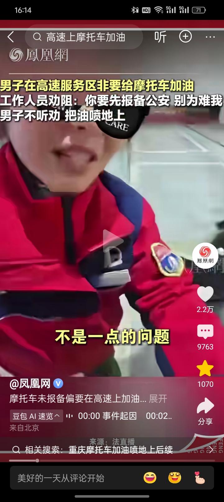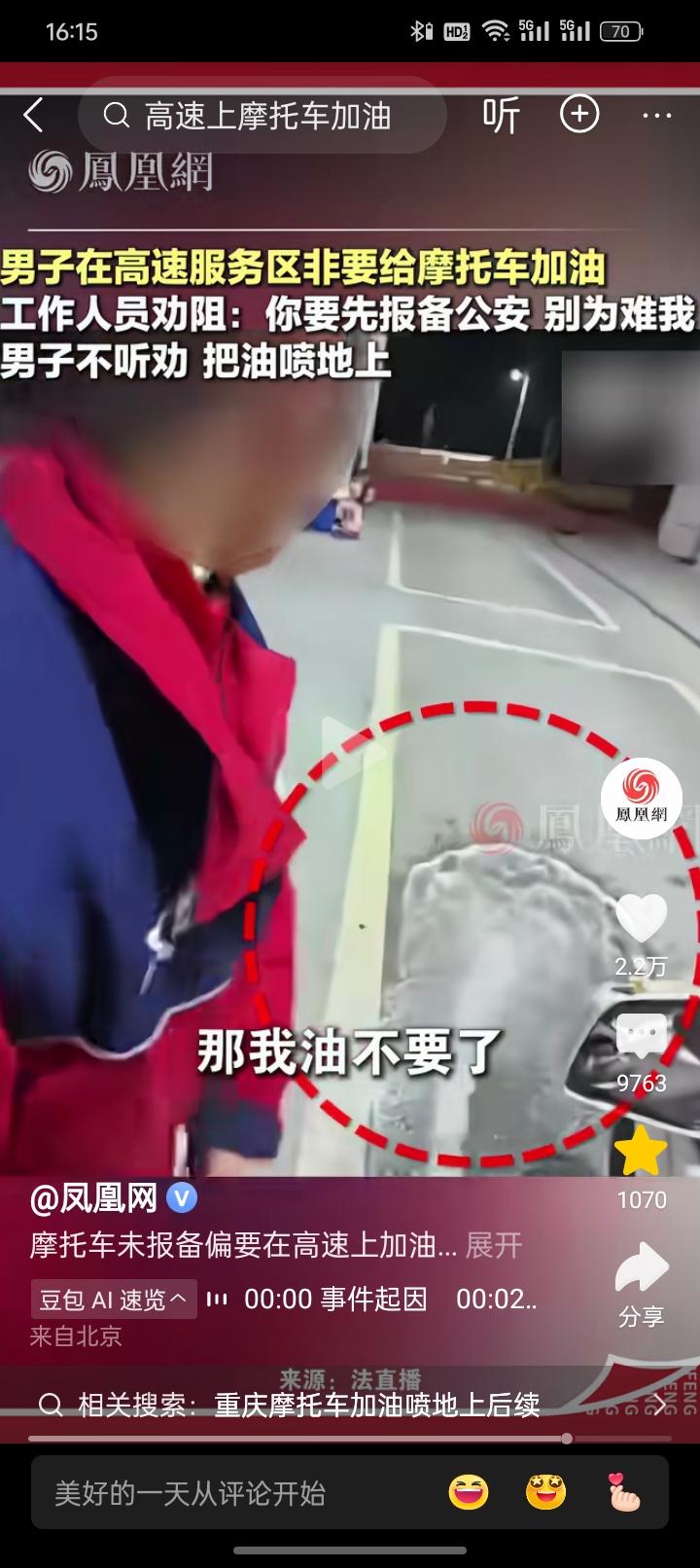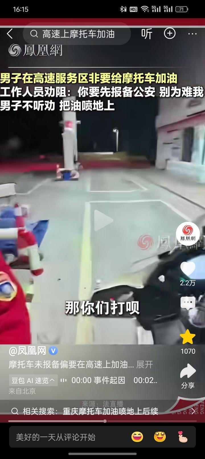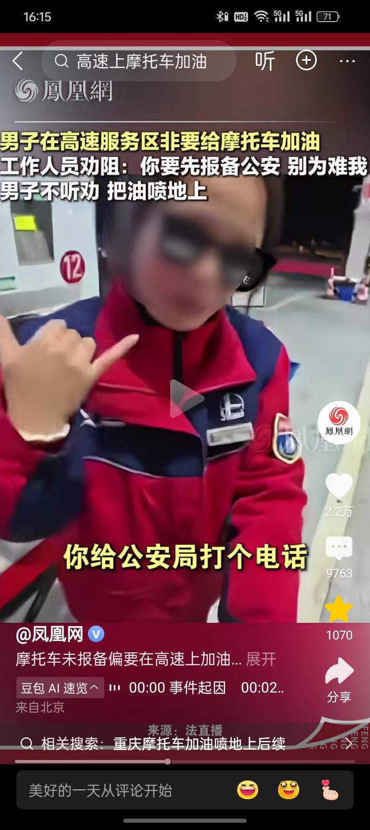 的确太离谱了! 一男子在高速服务区,强行拔油枪给摩托车加油,遭到加油站的工作人员阻止和拒绝,并提醒摩托车车主不能强行加油,会让她丢了工作。想不到男子不依不饶,坚持要拿油枪给摩托车加油,还说只加5块钱下高速。 工作人员一再强调男子在高速服务区加油,必须要先公安部门报备,同意了才可以。男子坚决自己不打电话报备,反而把责任推给工作人员,还叫嚣如果不给他加,加把油喷在地上。 女工作人员无力阻止,男子把汽车喷在地上,并趁着女工作人员走开寻求帮助的时候,直接把油加到自己的摩托车! 不少网友看完以后,都纷纷表示,男子真的是摊上大事了。并提醒他犯了几个错误。 一,强行违反相关规定,不报备,不听劝告,就在高速服务区强行给摩托车加油。 二,直接把汽油喷到地上,这就是妥妥的寻衅滋事。 三,汽油一旦遇到明火发生火灾,安全隐患非常大。 毫无疑问,男子的行为真的是大错特错啊!男子高速服务区不听劝告强行加油,遭拒绝把油滋地上 高速上摩托车