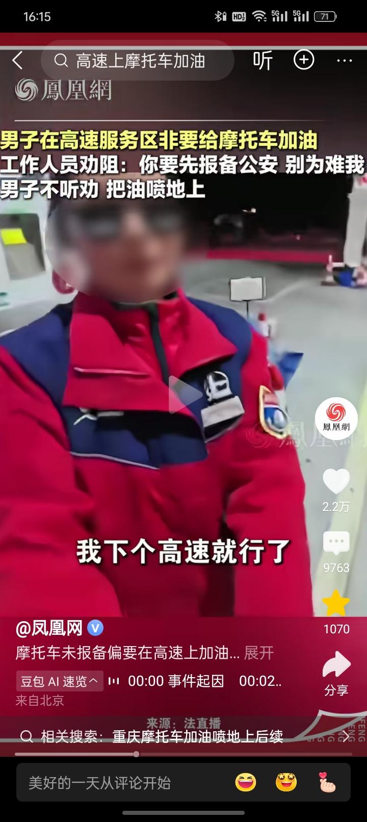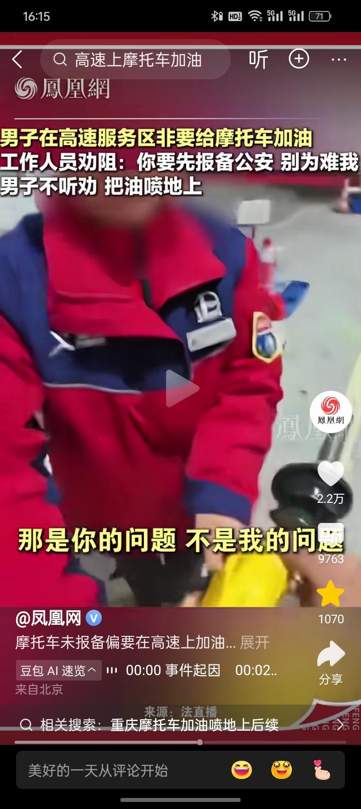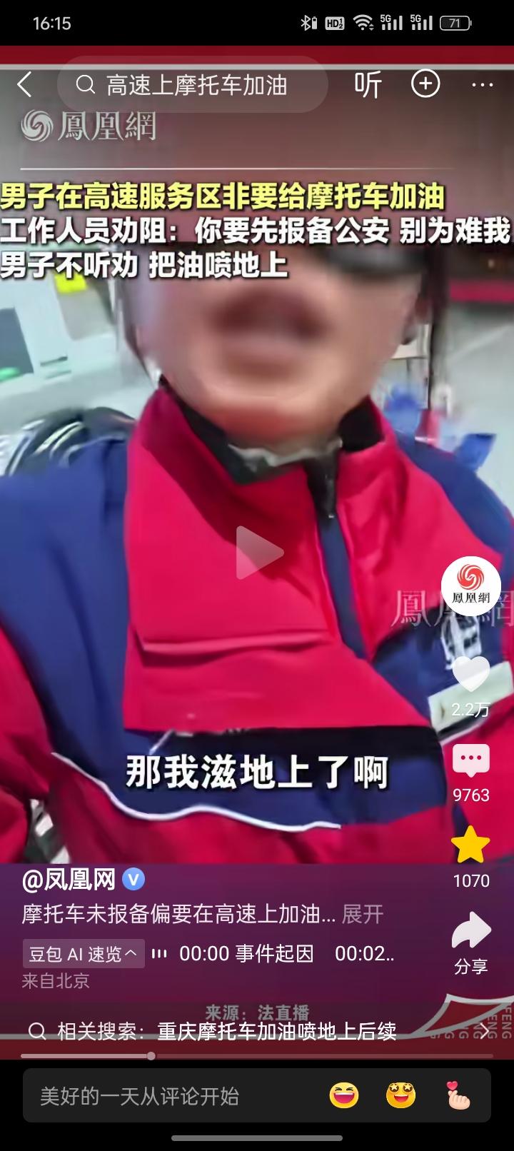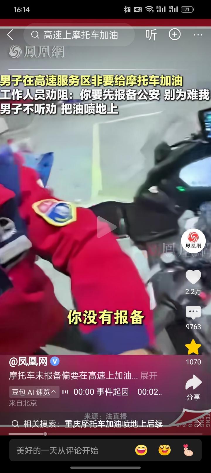 的确太离谱了! 一男子在高速服务区,强行拔油枪给摩托车加油,遭到加油站的工作人员阻止和拒绝,并提醒摩托车车主不能强行加油,会让她丢了工作。想不到男子不依不饶,坚持要拿油枪给摩托车加油,还说只加5块钱下高速。 工作人员一再强调男子在高速服务区加油,必须要先公安部门报备,同意了才可以。男子坚决自己不打电话报备,反而把责任推给工作人员,还叫嚣如果不给他加,加把油喷在地上。 女工作人员无力阻止,男子把汽车喷在地上,并趁着女工作人员走开寻求帮助的时候,直接把油加到自己的摩托车! 不少网友看完以后,都纷纷表示,男子真的是摊上大事了。并提醒他犯了几个错误。 一,强行违反相关规定,不报备,不听劝告,就在高速服务区强行给摩托车加油。 二,直接把汽油喷到地上,这就是妥妥的寻衅滋事。 三,汽油一旦遇到明火发生火灾,安全隐患非常大。 毫无疑问,男子的行为真的是大错特错啊!男子高速服务区不听劝告强行加油,遭拒绝把油滋地上 高速上摩托车