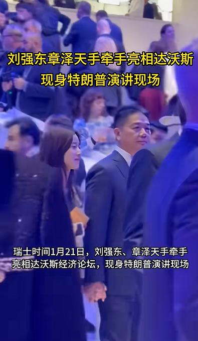 刘强东与妻子章泽天现身达沃斯! 瑞士时间1月21日,在达沃斯经济论坛现场,京东集团创始人刘强东与妻子章泽天手牵手出现在特朗普演讲现场。 画面中东哥一身深色西装,尽显企业家的沉稳与自信。章泽天的身穿小香风外套,妆容自然,面带微笑,显得亲切而不失端庄。