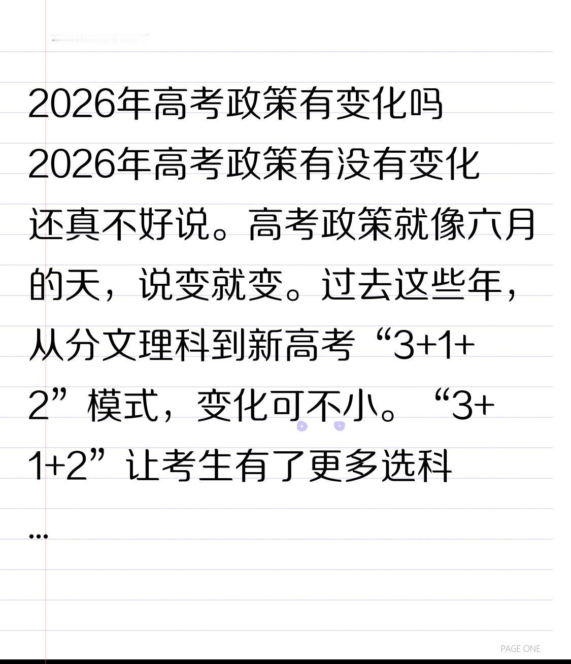 2026年高考政策有变化吗 2026年高考政策有没有变化还真不好说。高考政策就像六月的天,说变就变。过去这些年,从分文理科到新高考“3+1+2”模式,变化可不小。“3+1+2”让考生有了更多选科组合,能选自己擅长和喜欢的科目。 不过呢,每年教育部门都会根据实际情况调整政策,比如高校招生名额、加分政策等。说不定2026年也会有新的调整,可能会在考试内容、录取方式上有变动。考生和家长只能多关注教育部门消息,提前做好准备,以不变应万变。
