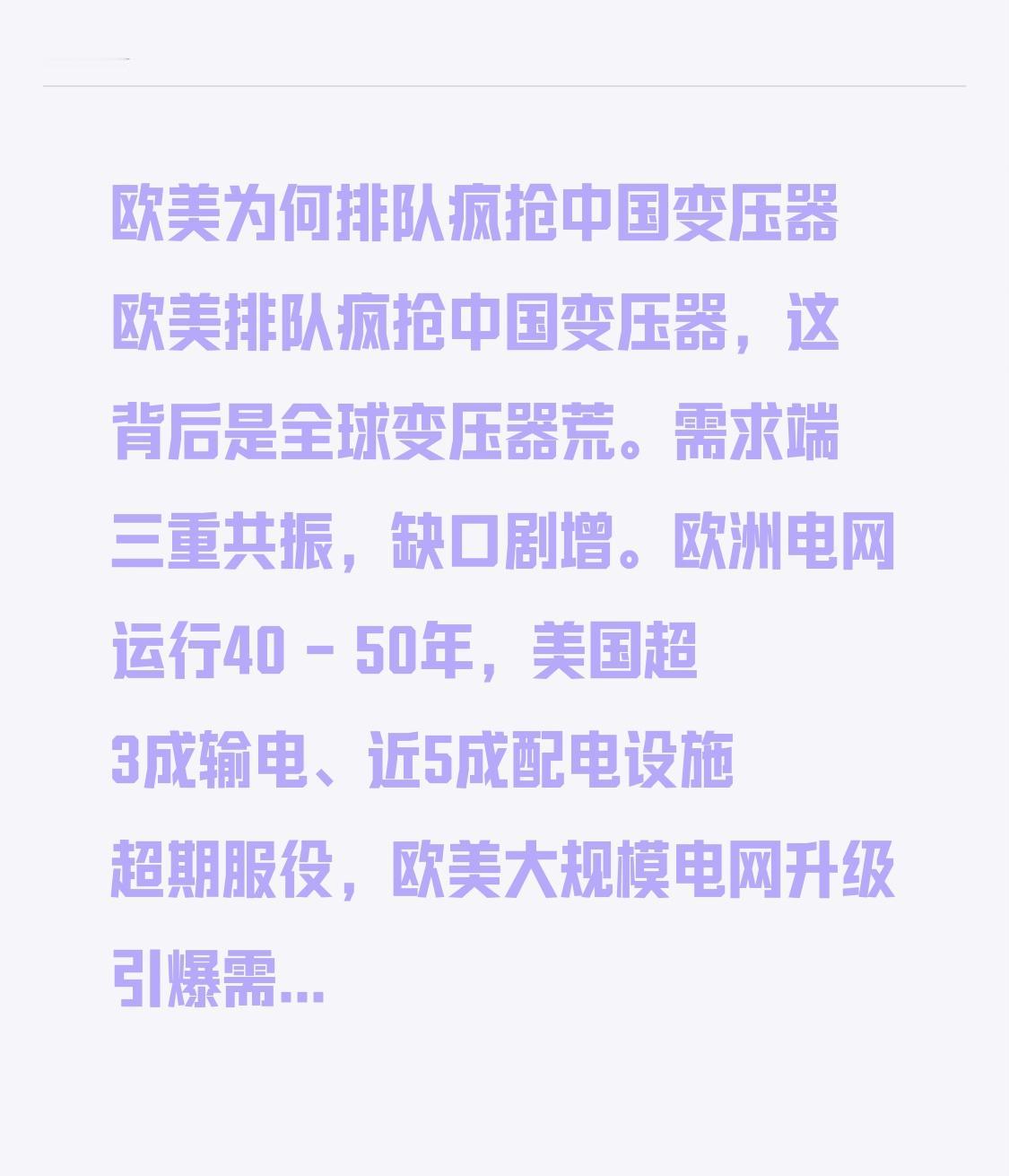 欧美为何排队疯抢中国变压器 欧美排队疯抢中国变压器,这背后是全球变压器荒。需求端三重共振,缺口剧增。欧洲电网运行40 - 50年,美国超3成输电、近5成配电设施超期服役,欧美大规模电网升级引爆需求。新能源与AI新场景爆发,光伏电站需求是火电8倍,全球缺口约30%。而供给侧滞后,欧美本土产能不足,审批约束强,产业链不完整。 中国则优势明显,产能占全球超60%,有完整产业链,取向硅钢产量高。交付与定制能力强,欧美交货期常超100周,中国可压缩至12周左右。2025年中国变压器出口额大增36%,单台均价涨超30.5%,欧美抢疯了。