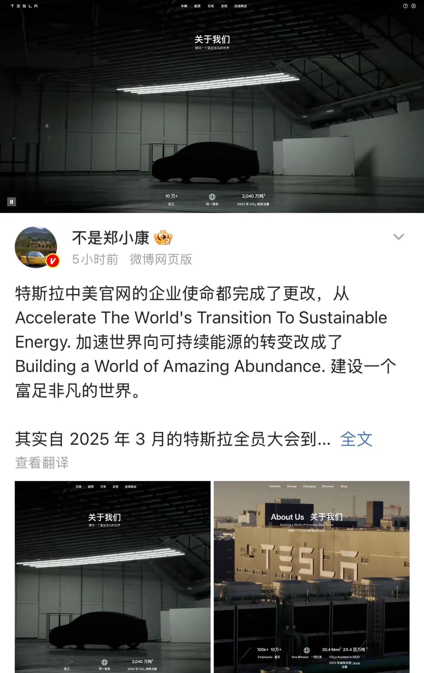 特斯拉换使命了…从「加速可持续能源的转变」改成了「建设一个富足非凡的世界」,简单说就是从活下去变成了过的更好…新能源汽车 特斯拉 特斯拉model3 特斯拉modelY