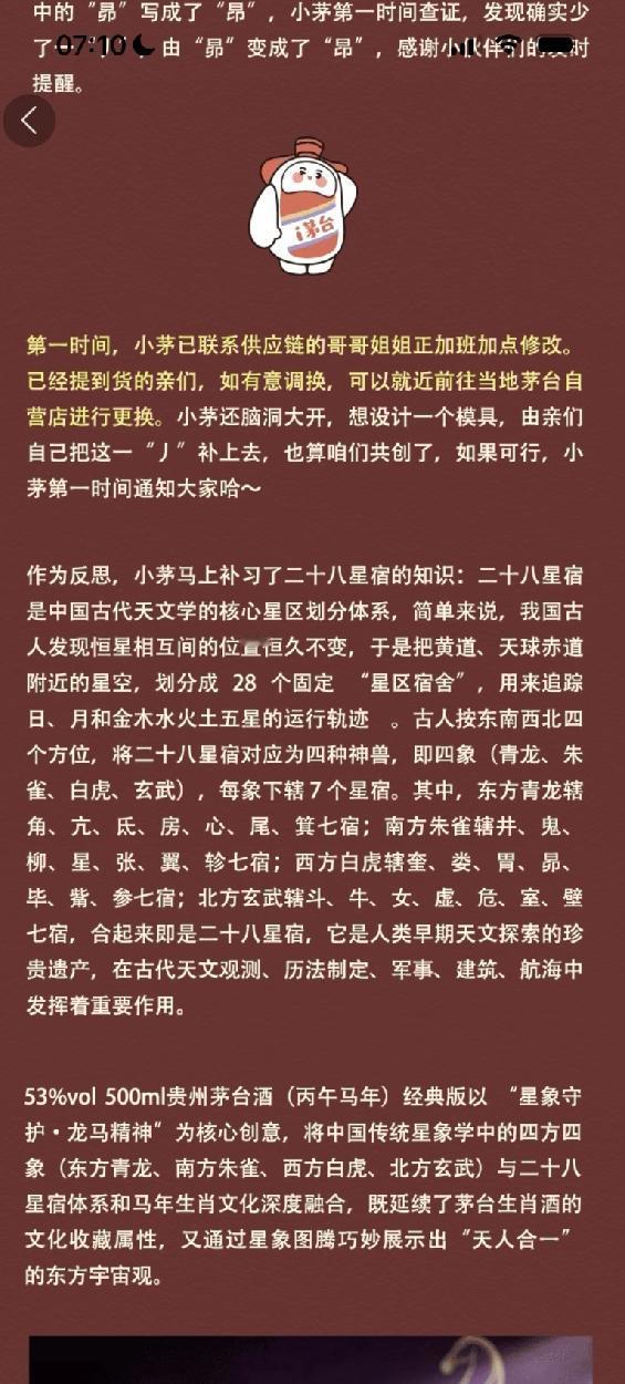 马年茅台居然印错字了,这世界真像个巨大的草台班子!2026年批次500ml经典马茅,外盒侧标把“昴日星官”的“昴”错印成了“昂”。茅台官方都发文确认是印刷失误了。不过有意思的是,错版往往意味着稀缺呀,感觉这马茅以后可能要涨价呢。