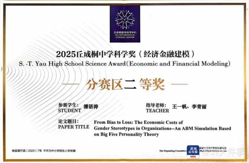 #高三女生凭科研论文斩获丘成桐奖#【深圳高三女生自学成才获大奖,用科研论文打破性别偏见!】#高三女生用建模研究打破性别偏见# “你曾因为性别、外貌或专业被贴上过什么标签?又是如何打破它的?”“小时候他们说女生练不好体育,长大后他们说女生学不好理科。”这个冬天,荣获2025年丘成桐中学科学奖的深圳00后少女潘语涛,用一份“硬核”的学术研究,狠狠回击了社会对女性的偏见,她拒绝标签、自学成才的励志成长故事,也温暖了无数人。在这个“看脸的时代”,她选择用逻辑和数据来证明:“女生不仅能练好体育、学好理科,更能为社会问题发声!”目前就读于建文外国语学校高三(12)班的潘语涛同学,在素有“华人青少年诺贝尔奖”之称的2025年丘成桐中学科学奖中,凭借经济金融建模赛道的课题研究《从偏见到损失:组织中性别刻板印象的经济成本——基于ABM和大五人格理论的仿真研究》,从全球2800余支参赛队伍中脱颖而出,斩获二等奖。在这个“专业对口”的社会,当别人还在纠结自己是文科生还是理科生时,潘语涛已经学会运用理工科工具来解决人文社科痛点,探索改变世界的可能。从小就痴迷“人与社会如何互动”的她,总能捕捉到那些隐藏在日常中的社会规则,而生活中频繁出现的“女生不擅长理科”的偏见,成为点燃她科研热情的导火索。“我尝试能不能把人文和科技相结合,就像我这次使用了ABM的这种计算机社会学的方法,去让它能够更好地被人理解......”潘语涛说。“这种偏见如何渗透到组织中影响效率?”带着这份追问,潘语涛踏上了科研之路。她不想止步于“偏见导致损失”的宏观结论,而是决心自下而上地模拟从个体行为到组织结果的全链条影响,用科学方法揭开偏见背后的经济逻辑。网页链接