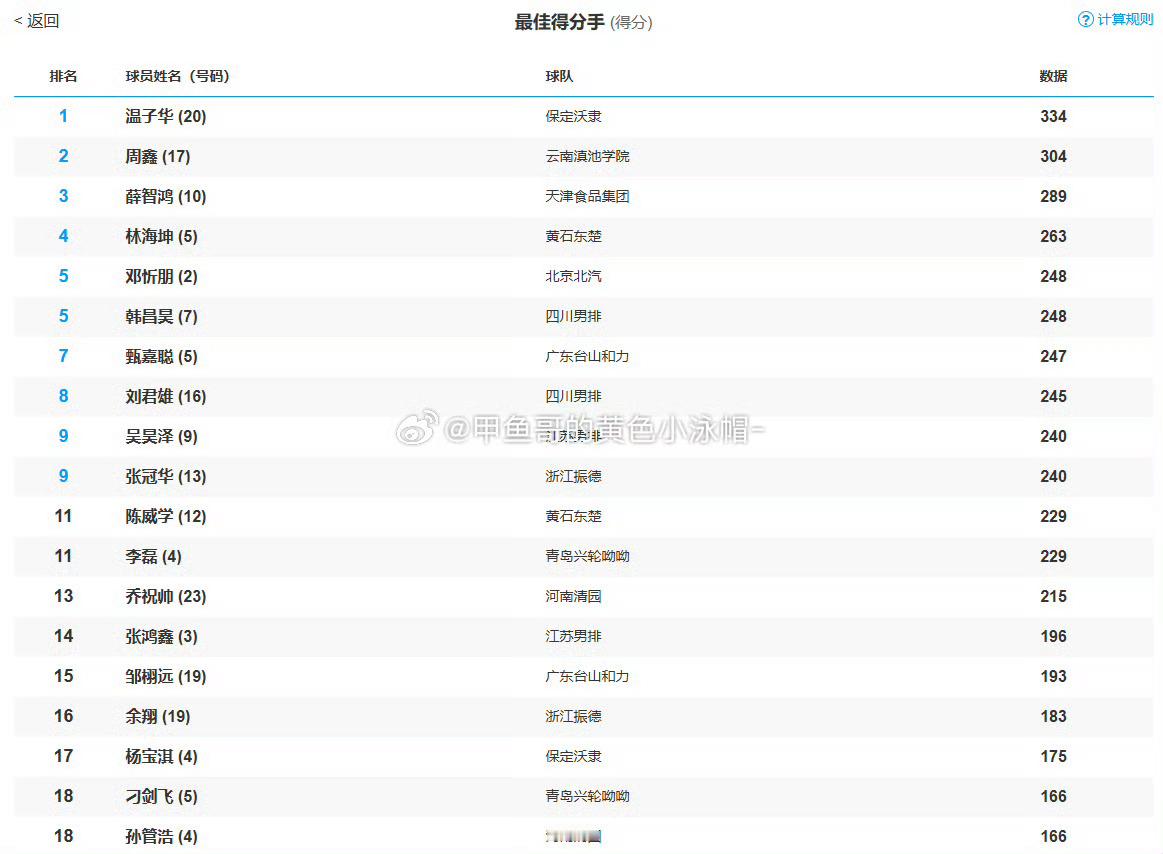 2025-2026中国女排超级联赛男、女排联赛得分榜排名,官方给的这个数据是错的你们可以算一下场均得分,有点离谱