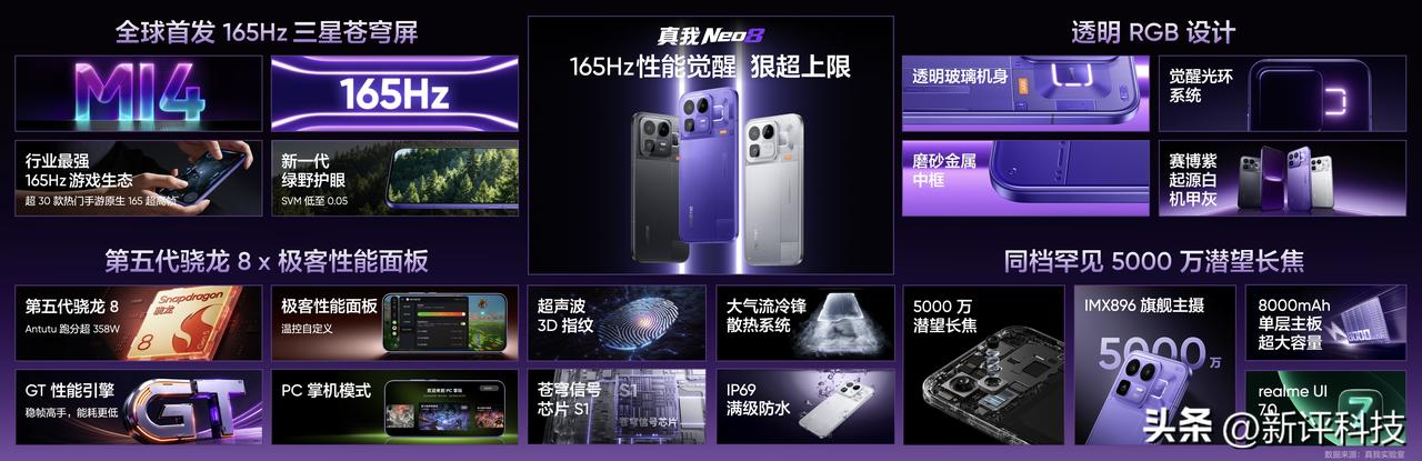 正式发布: 透明外观设计,觉醒光环RGB,金属中框,玻璃后盖,「赛博紫」「起源白」「机甲灰」三款配色。 1.5K 165Hz三星屏,M14发光材料。 骁龙8Gen5处理器,新一代极客性能面板,自定义温控档位,PC掌机模式。 5000万像素主摄,5000万像素3.5倍潜望长焦,8000mAh电池+80W充电。 IP66+IP68+IP69,超声波3D指纹、立体双扬声器、X轴线性马达。 4年系统维护支持3个安卓大版本更新 售价: 12GB+256GB 2399元 16GB+256GB 2699元 12GB+512GB 2899元 16GB+512GB 3199元 16GB+1TB 3699元 国补价2039.15起 真我手机今年4月全面接入OPPO售后服务