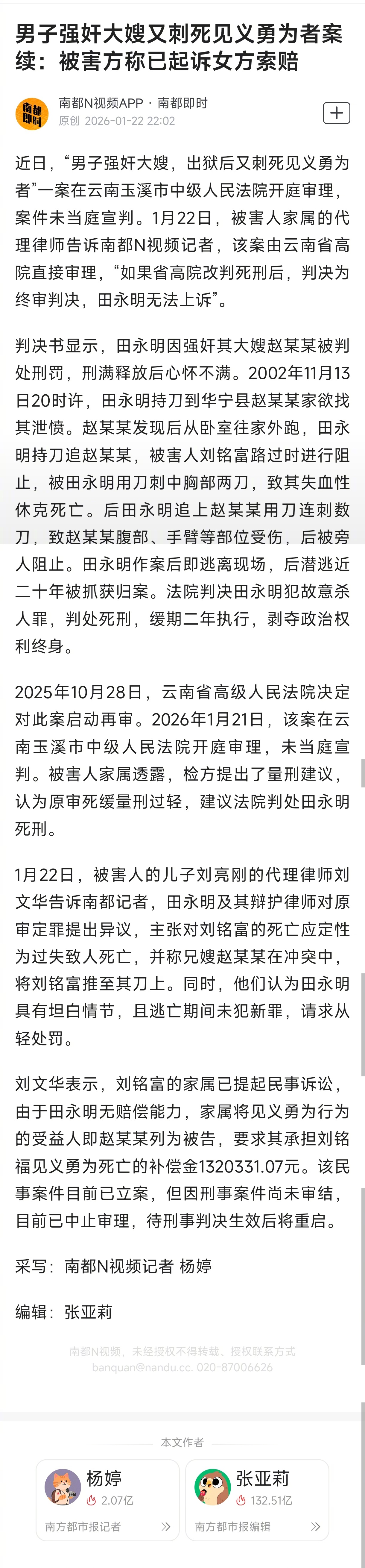 #检方建议改判田永明死刑#【男子强奸大嫂又刺死见义勇为者案续:被害方称已起诉女方索赔】#见义勇为者家属起诉被救大嫂#近日,“男子强奸大嫂,出狱后又刺死见义勇为者”一案在云南玉溪市中级人民法院开庭审理,案件未当庭宣判。1月22日,被害人家属的代理律师告诉南都N视频记者,该案由云南省高院直接审理,“如果省高院改判死刑后,判决为终审判决,田永明无法上诉”。判决书显示,田永明因强奸其大嫂赵某某被判处刑罚,刑满释放后心怀不满。2002年11月13日20时许,田永明持刀到华宁县赵某某家欲找其泄愤。赵某某发现后从卧室往家外跑,田永明持刀追赵某某,被害人刘铭富路过时进行阻止,被田永明用刀刺中胸部两刀,致其失血性休克死亡。后田永明追上赵某某用刀连刺数刀,致赵某某腹部、手臂等部位受伤,后被旁人阻止。田永明作案后即逃离现场,后潜逃近二十年被抓获归案。法院判决田永明犯故意杀人罪,判处死刑,缓期二年执行,剥夺政治权利终身。2025年10月28日,云南省高级人民法院决定对此案启动再审。2026年1月21日,该案在云南玉溪市中级人民法院开庭审理,未当庭宣判。被害人家属透露,检方提出了量刑建议,认为原审死缓量刑过轻,建议法院判处田永明死刑。1月22日,被害人的儿子刘亮刚的代理律师刘文华告诉南都记者,田永明及其辩护律师对原审定罪提出异议,主张对刘铭富的死亡应定性为过失致人死亡,并称兄嫂赵某某在冲突中,将刘铭富推至其刀上。同时,他们认为田永明具有坦白情节,且逃亡期间未犯新罪,请求从轻处罚。刘文华表示,刘铭富的家属已提起民事诉讼,由于田永明无赔偿能力,家属将见义勇为行为的受益人即赵某某列为被告,要求其承担刘铭福见义勇为死亡的补偿金1320331.07元。该民事案件目前已立案,但因刑事案件尚未审结,目前已中止审理,待刑事判决生效后将重启。采写:南都N视频记者 杨婷