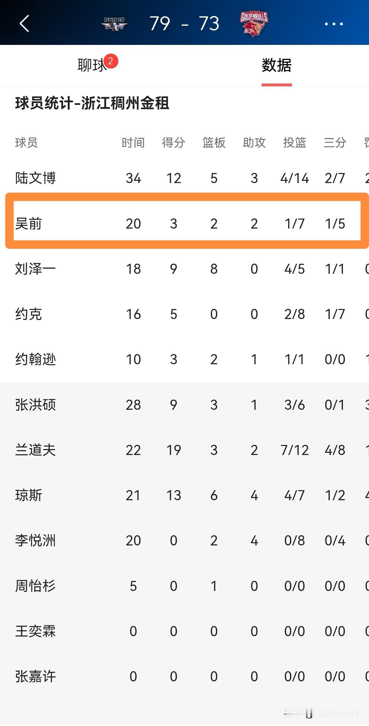 谁能拯救一下浙江稠州金租老将吴前的三分球?在今天浙江稠州金租客场以73:79不敌北京北汽的比赛中,吴前的手感犹如掉进了冰窟一样。全场比赛下来,吴前首发出战20分钟,投篮7中1,其中三分球5中1非常低效的得到3分,还出现了4次失误和4次犯规。 不得不说,吴前真的老了,当吴前面对对手的高强度防守时,他再也不能像年轻时那样从容不迫了。
