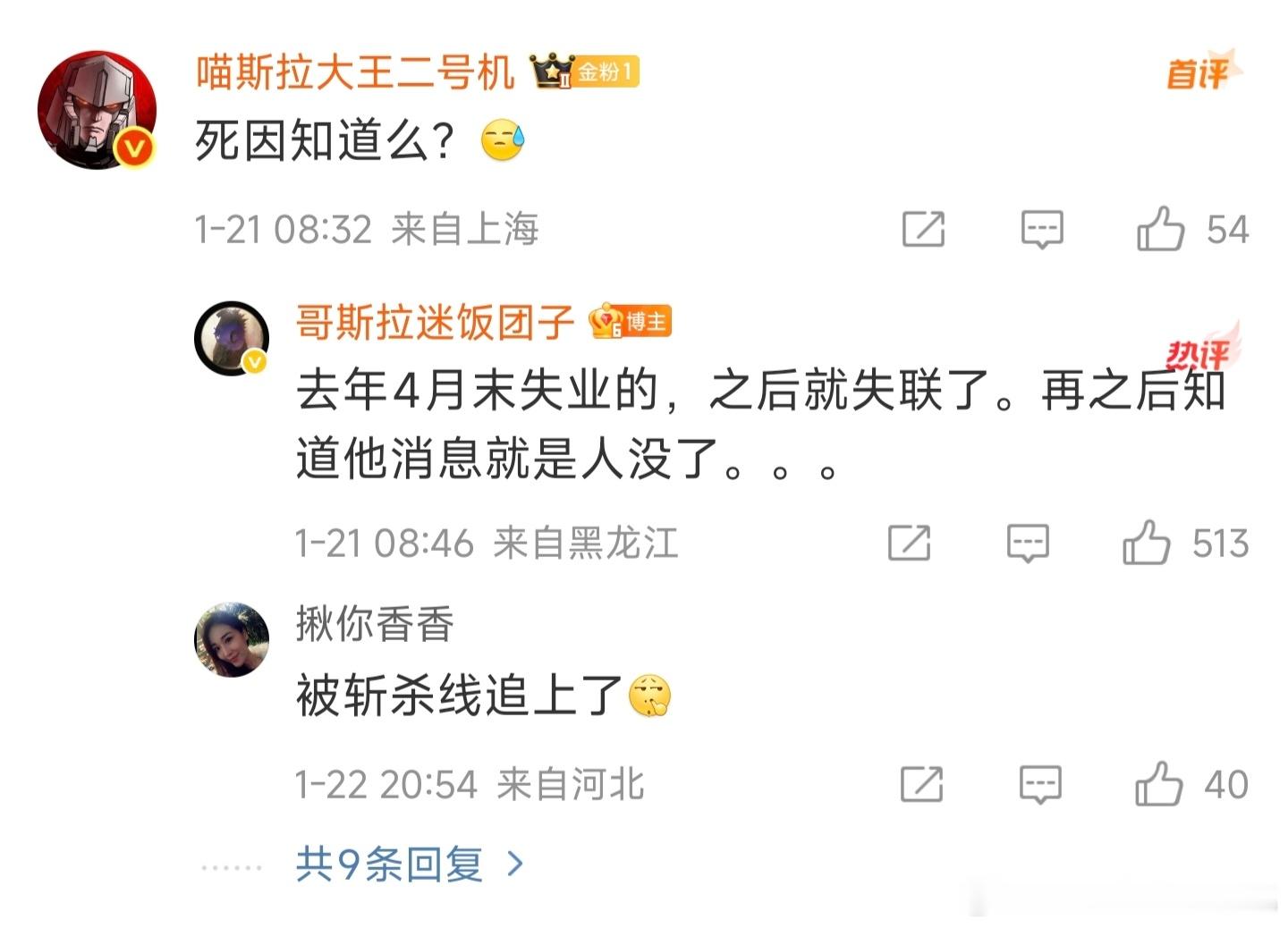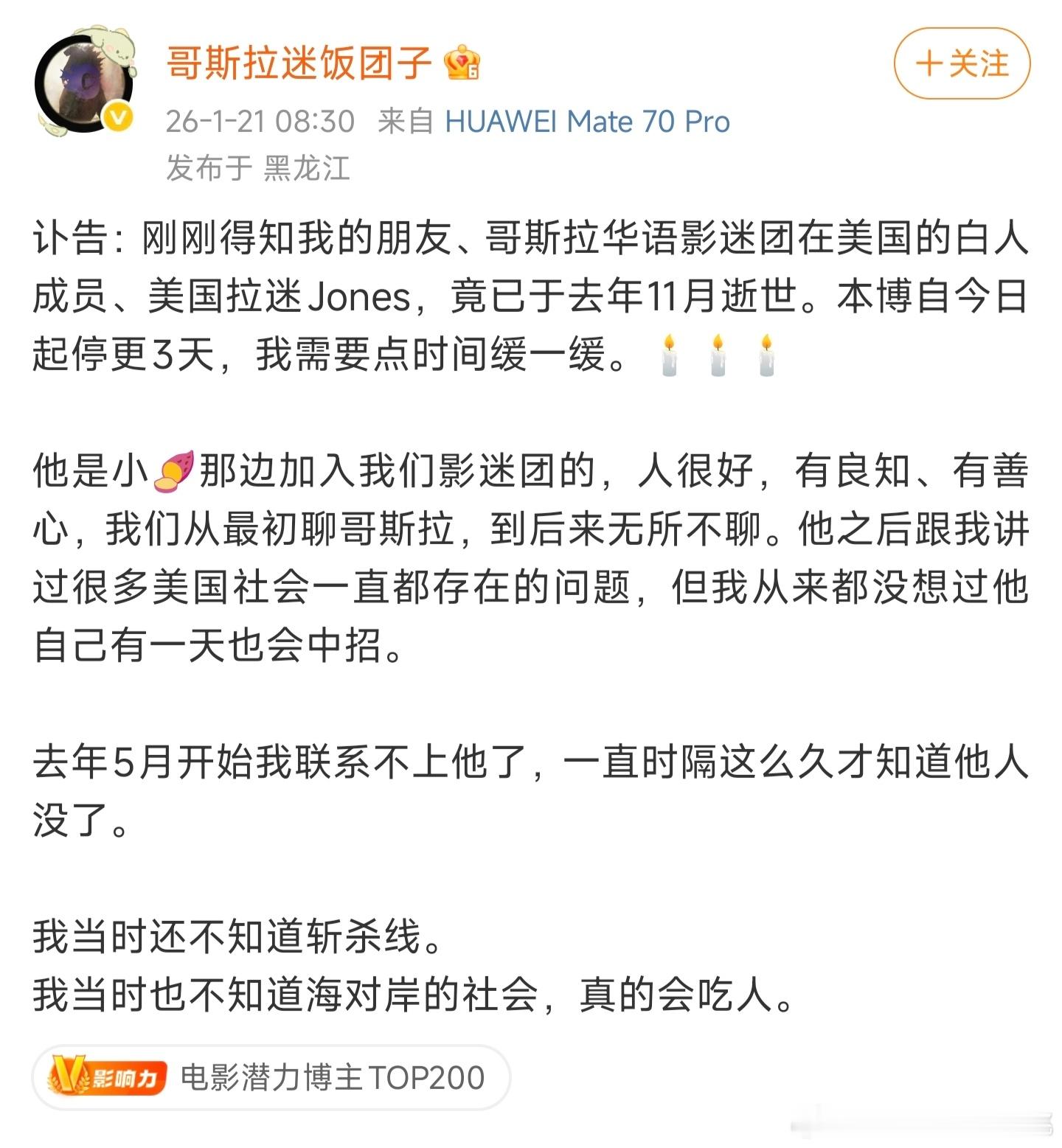 哥斯拉华语影迷团失去了一位美国成员,这位白人老哥名叫Jones,在中国社交媒体上与华语影迷团结缘。不料去年4月末Jones遭遇失业,紧接着就失联了,直到如今华语影迷团这边儿才得知他其实早在11月份就已经去世了。华语影迷团博主发文表示:去年5月刚与Jones失联时,我还不知道斩杀线。离谱事件魔金石科技