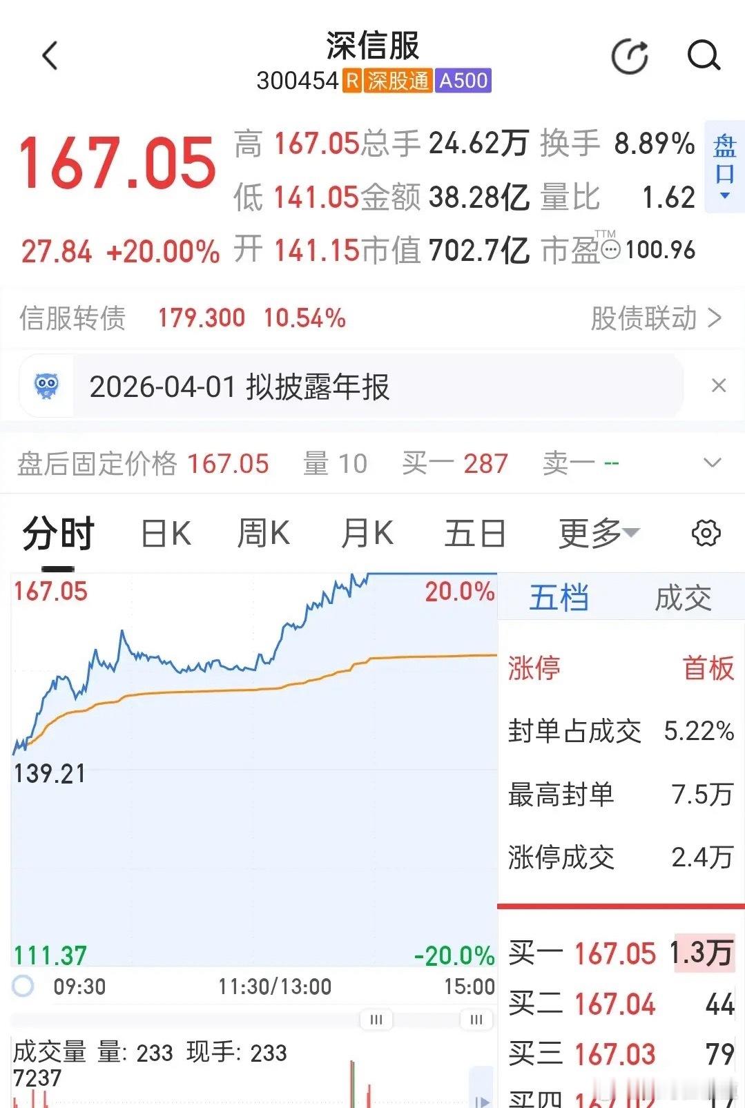 深信服今天直接走出20CM涨停的强势行情,妥妥的信创+网络安全板块绝对龙头,今开141.15元后下探141.05元就快速企稳拉升,尾盘直接封死涨停价167.05元,换手率8.89%、成交额38.28亿,量能温和放大是健康的补量走势,主力资金实打实净流入1.98亿,机构也净买入2693万托底,虽说北向资金净卖出1.46亿,但这只是前期获利盘的小幅兑现,压根不是砸盘,整个盘口就是资金主动抢筹、筹码锁定性超棒的状态。明天这票肯定不会下跌,大概率是冲高震荡甚至继续走强,理由如下:一是它作为板块领涨龙头,今天直接带飞信创(涨1.87%)和网络安全板块,板块本身主力也净流入2.55亿,资金做多情绪拉满,龙头股的涨势本身就有惯性;二是资金面承接力超硬,主力和机构双双加仓,北向的卖出量完全被市场接下,涨停板全程没开板,筹码锁定特别好,没有任何资金出逃的信号;三是今天低开高走封死20CM的走势把技术面走顺了,短期趋势彻底走强,而且目前市场正炒AI和信创的高景气赛道,深信服踩中主线风口,有题材和资金双重加持,压根没下跌的逻辑,顶多是北向获利盘兑现带来的小幅冲高震荡,完全不用担心下跌。预测明天最高价186.55,次高价180.05,次低价154.05,最低价134.55。