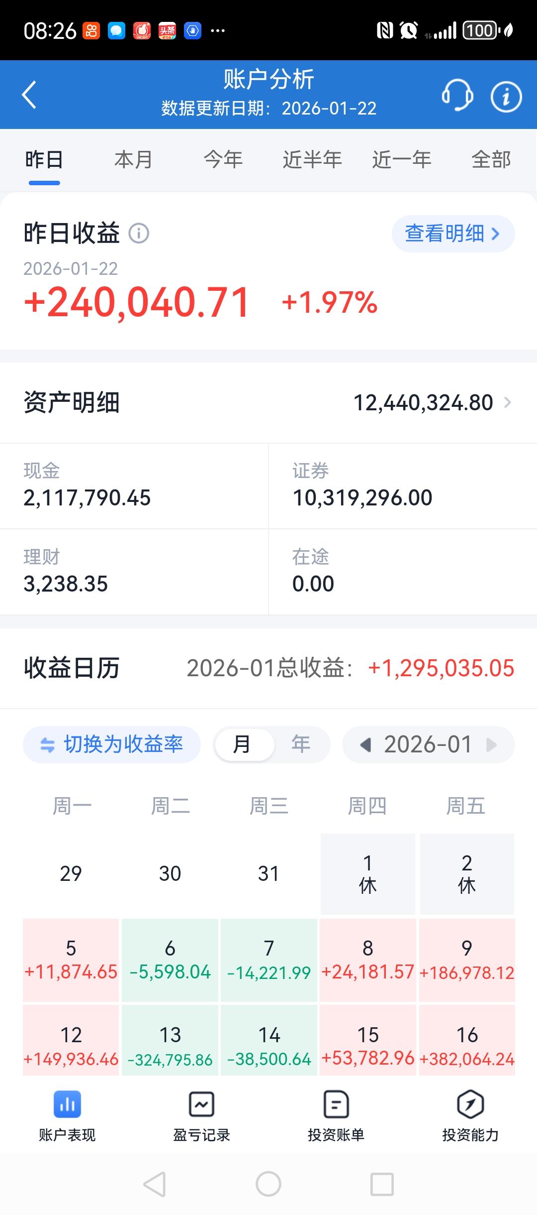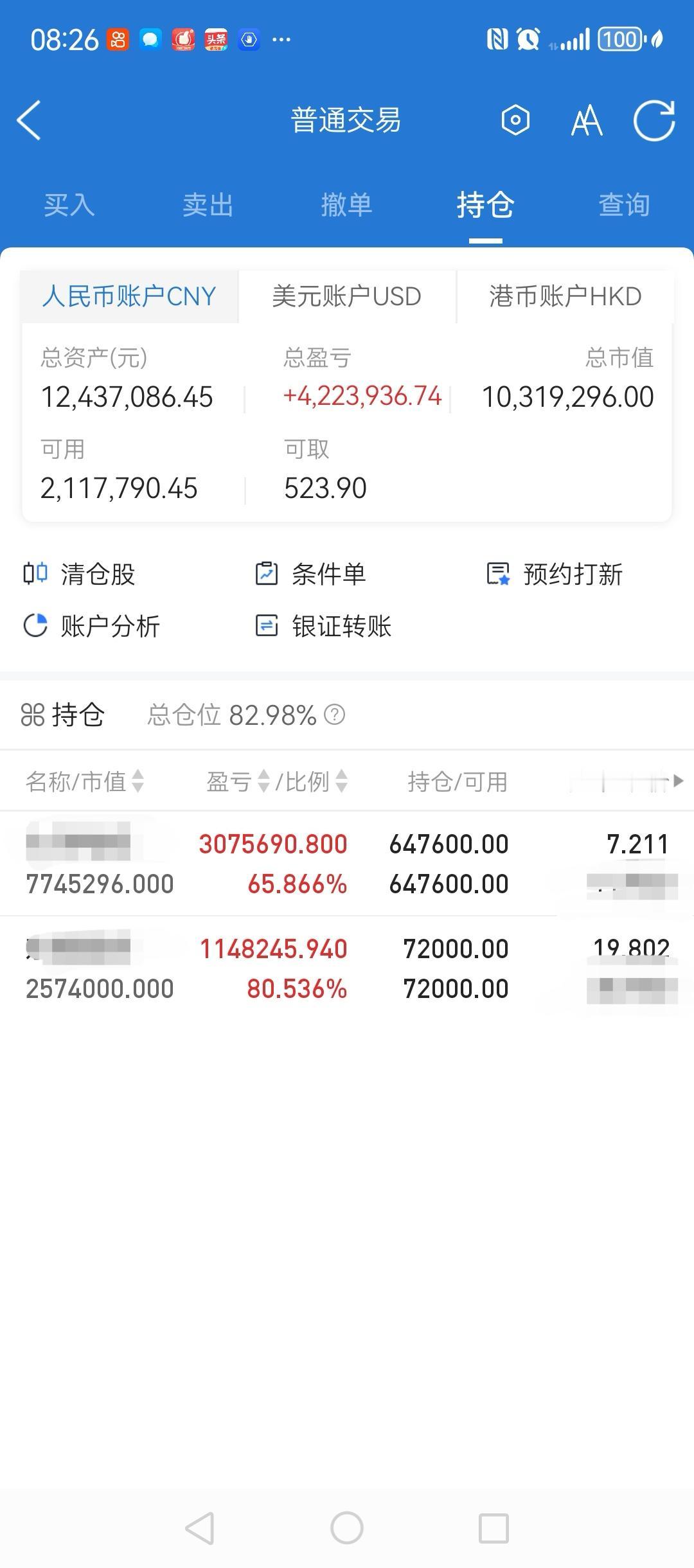 账户真实,不是模拟的。220万的本金,收益已于昨天突破1000万,收益率达到464%。 目前账户腾出了200多万的资金,作为后备力量,随时可以投入战场。持有的两个股票,都是人形机器人板块的股票,已经持有一年多的时间,目前上涨又开始加速。 我的理念是,好价格买入好股票不赚钱不卖,甚至不赚大钱不卖。 说的具体一点,就是择时买入,处于上升趋势,且相对低位,交易相对活跃的主流行业的核心龙头个股,不赚钱不卖,甚至不赚大钱不卖。