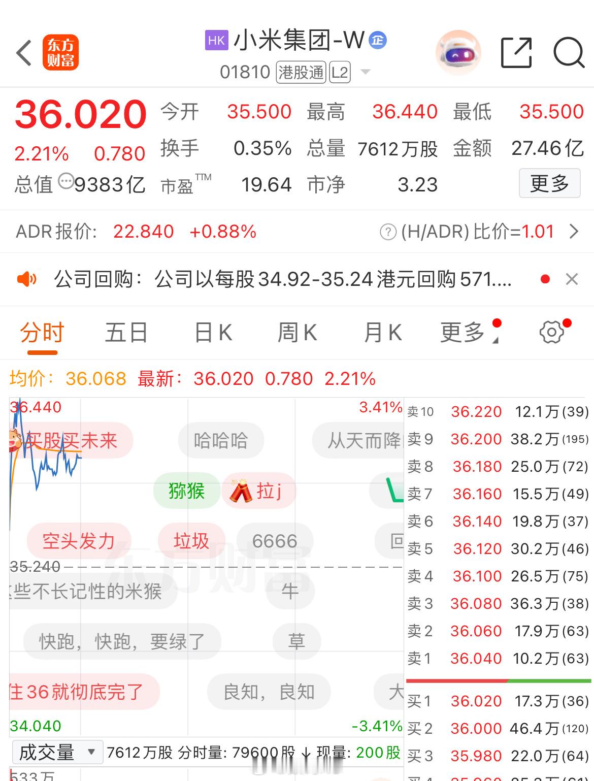 昨天小米公布的回购计划还是很有效果的,今日小米股票涨了2.21%,最高来到了36.440,这弹幕每次看都挺有意思,小米要是涨了,这些小黑子气的挺狠,要是小米跌了,这些人就很高兴
